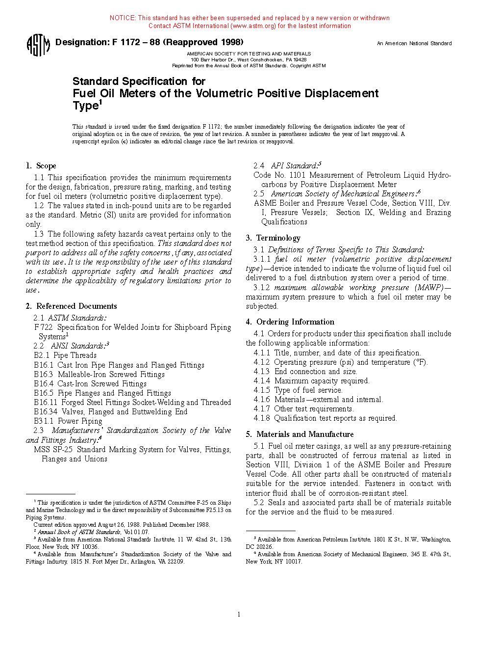 1.1 This specification provides the minimum requirements for the design, fabrication, pressure rating, marking, and testing for fuel oil meters (volumetric positive displacement type).