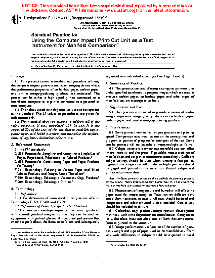 1.1 This practice covers a standardized procedure utilizing the computer impact print-out unit as an imaging device where the performance properties of carbonless paper, carbon paper, and similar image-producing products are measured. The printer can be either a high speed printer connected to a mainframe computer or a printer connected to a personal or mini-computer.