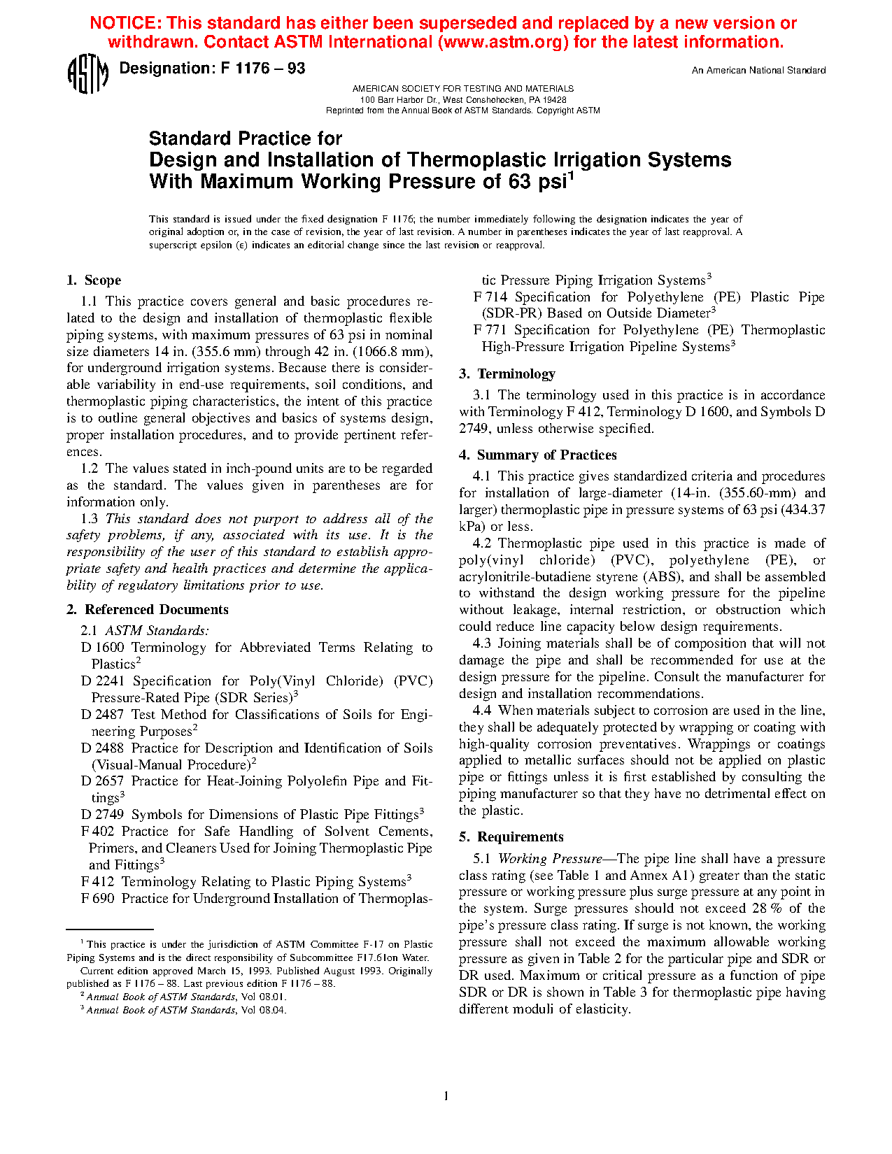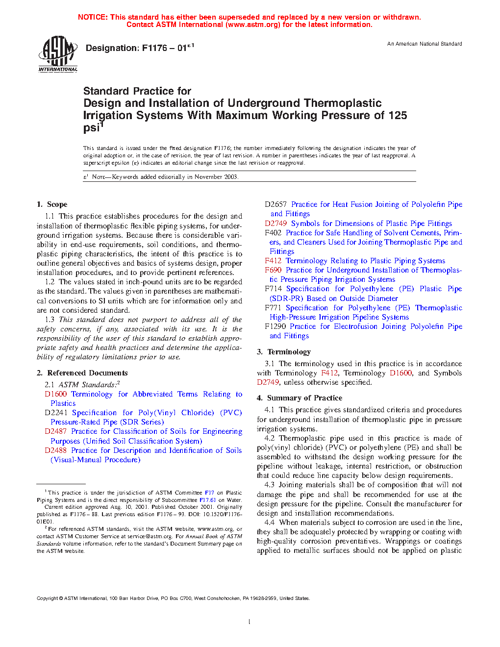 1.1 This practice establishes procedures for the design and installation of thermoplastic flexible piping systems, for underground irrigation systems. Because there is considerable variability in end-use requirements, soil conditions, and thermoplastic piping characteristics, the intent of this practice is to outline general objectives and basics of systems design, proper installation procedures, and to provide pertinent references.