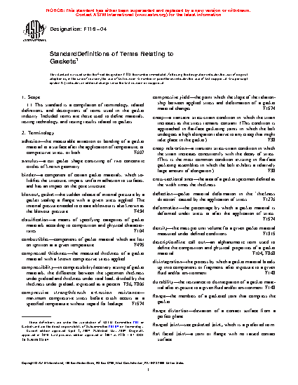 1.1 This standard is a compilation of terminology, related definitions, and descriptions of terms used in the gasket industry. Included terms are those used to define materials, testing technology, and testing results related to gaskets.