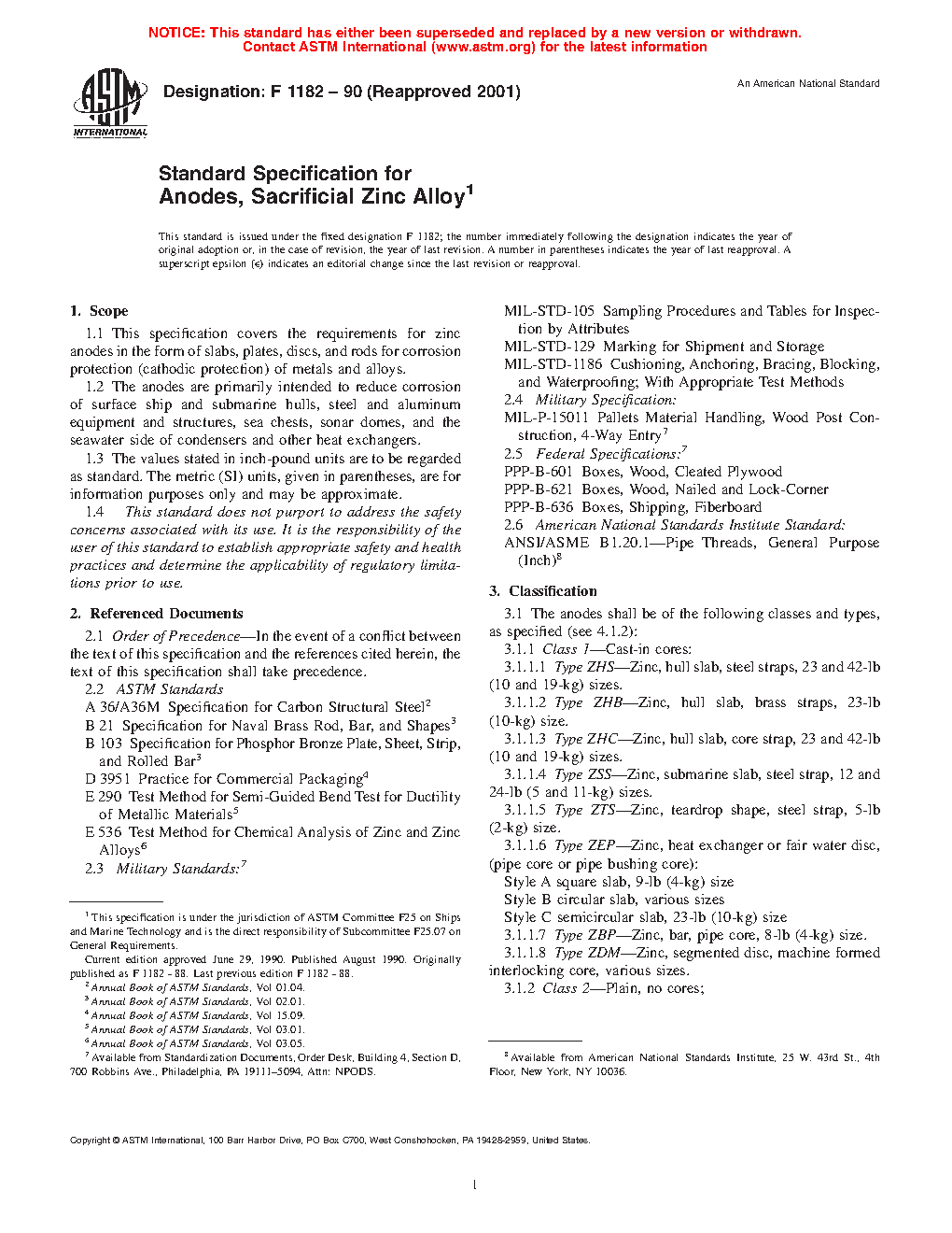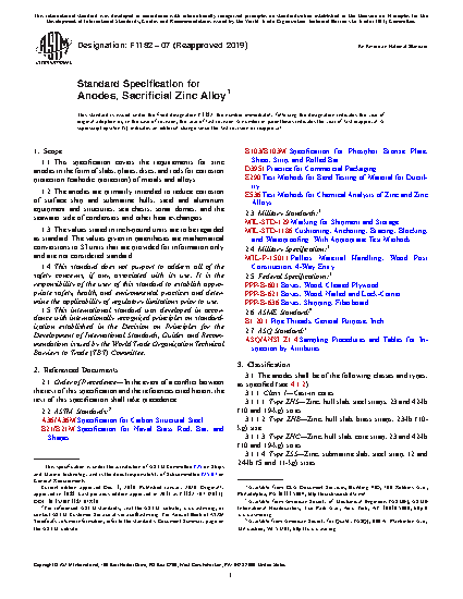 This specification covers the requirements for sacrificial anodes of zinc alloy in the form of slabs, plates, discs, and rods for corrosion protection (cathodic protection) of metals and alloys. These anodes are primarily intended to reduce corrosion of surface ship and submarine hulls, steel and aluminum equipment and structures, sea chests, sonar domes, and the seawater side of condensers and other heat exchangers. The anodes are available either as cast-in cores (Class 1) or plain with no cores (Class 2). Class 1 anodes shall be of the following types: Type ZHS—hull slabs with steel straps; Type ZHB—hull slabs with brass straps; Type ZHC—hull slabs with core straps; Type ZSS—submarine slabs with steel straps; Type ZTS—teardrop shapes with steel straps; Type ZEP—heat exchanger or fair water discs (pipe core or pipe bushing core) that are in the form of square slabs (Style A), circular slabs (Style B), and semicircular slabs (Style C); Type ZBP—bars with pipe cores; and Type ZDM—segmented discs with machine formed interlocking cores. Conversely, Class 2 anodes shall be of the following types: Type ZRN—extruded, drawn or rolled rods; and Type ZPN—rolled plates. Anodes shall conform to material and manufacture, chemical composition, mechanical property, and dimensional requirements specified uniquely for each type.