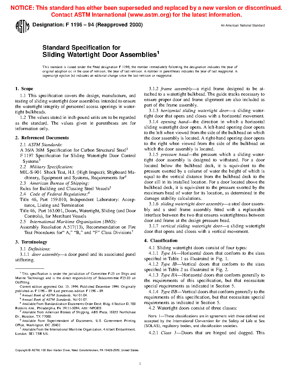 This specification covers the design, manufacture, and testing of sliding watertight door assemblies intended to ensure the watertight integrity of personnel access openings in watertight bulkheads. Sliding watertight doors consist of four types: type IA - horizontal doors, type IB - vertical doors, type IIA - horizontal doors, and type IIB - vertical doors. Watertight doors consist of three classes: class 1 - doors that are hinged and dogged, class 2 - sliding doors that are operable both locally and remotely by hand gear, and class 3 - sliding doors that are operable both locally and remotely by hand and by power. Hydrostatic test and visual examination shall be performed to meet the requirements prescribed.