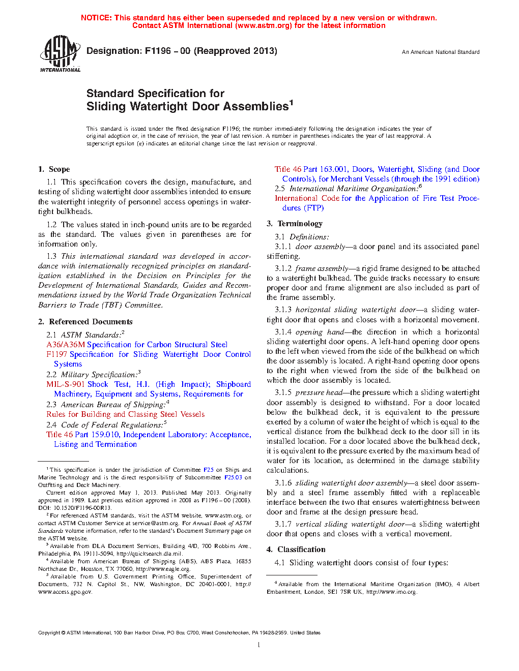 1.1 This specification covers the design, manufacture, and testing of sliding watertight door assemblies intended to ensure the watertight integrity of personnel access openings in watertight bulkheads.