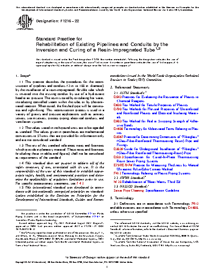 1.1 This practice describes the procedures for the reconstruction of pipelines and conduits (2 in. to 108 in. diameter) by the installation of a resin-impregnated, flexible tube which is inverted into the existing conduit by use of a hydrostatic head or air pressure. The resin is cured by circulating hot water, introducing controlled steam within the tube, or by photoinitiated reaction. When cured, the finished pipe will be continuous and tight-fitting. This reconstruction process is used in a variety of gravity and pressure applications such as sanitary sewers, storm sewers, process piping, electrical conduits, and ventilation systems.