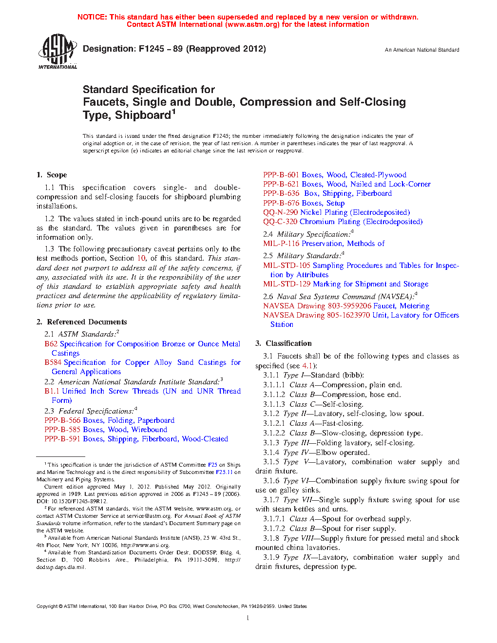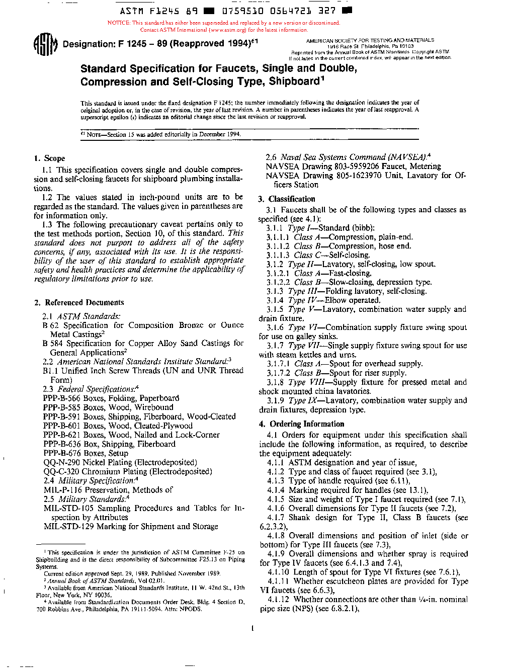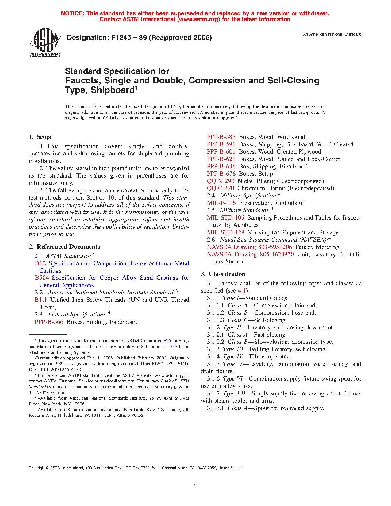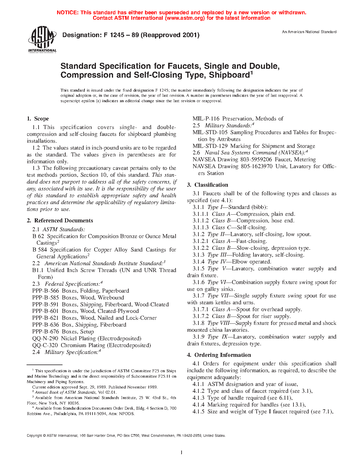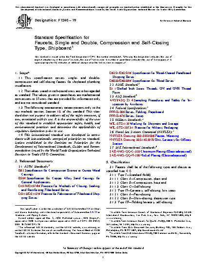 1.1 This specification covers single and double compression and self-closing faucets for shipboard plumbing installations.