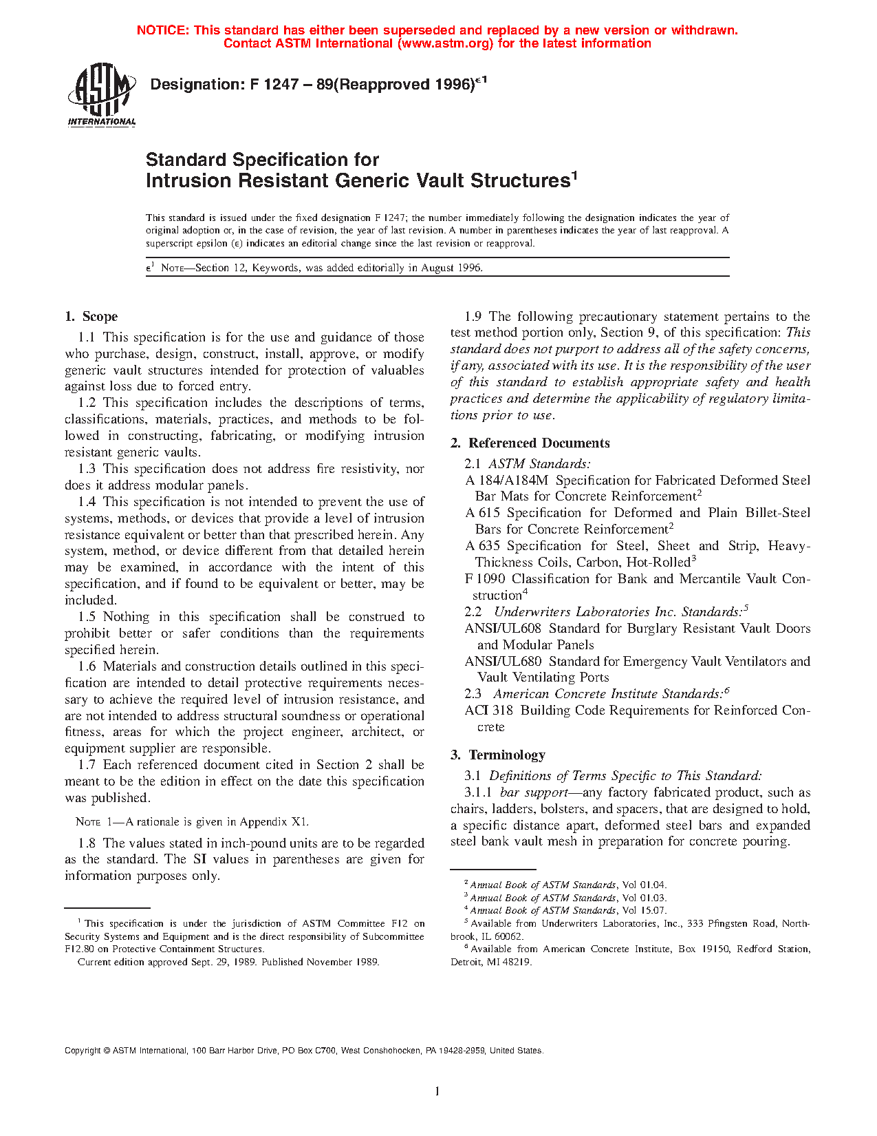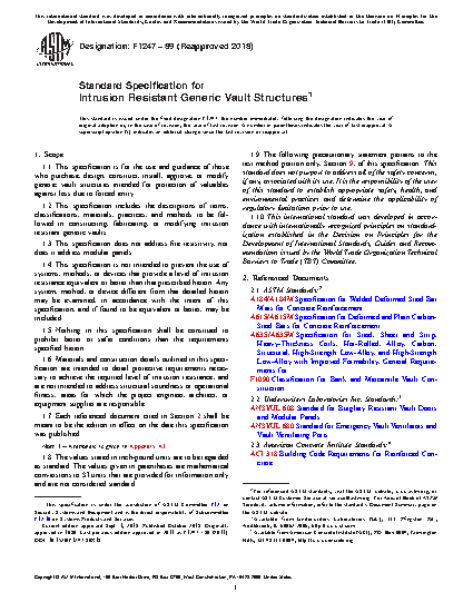 1.2 This specification includes the descriptions of terms, classifications, materials, practices, and methods to be followed in constructing, fabricating, or modifying intrusion resistant generic vaults.