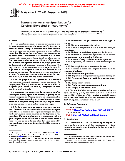 1.1 This specification covers stereotactic instruments used by neurosurgeons to assist in the placement of probes, such as cannulae, needles, forceps, or electrodes or to direct radiation into brain regions or anatomical targets that are not visible on the surface. The general location of these regions is determined by measurements from landmarks visualized by X ray or other means, such measurements being based on atlases derived from anatomical studies and autopsy. Because of the anatomical variability, more precise location in any single patient may be determined by physiological responses in that patient. The degree of success in stereotactic surgery depends upon the experience of the surgeon as well as the precision of the stereotactic instrument. Nevertheless, minimum standards of accuracy for stereotactic instruments that are within the range of variability of human anatomy must be maintained.