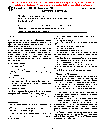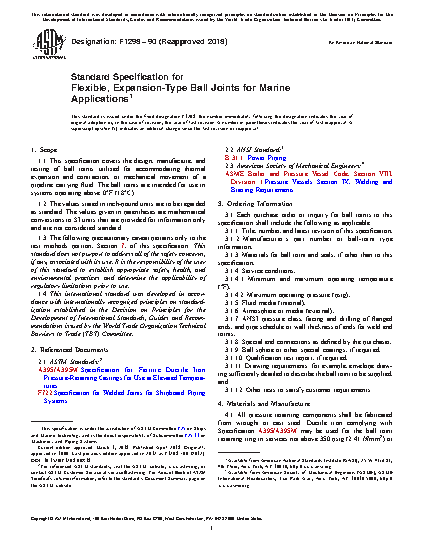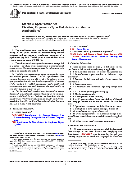 This specification covers the design, manufacture, and testing of ball joints utilized for accommodating thermal expansion and contraction, or mechanical movement of a pipeline carrying fluid. Ball joints shall be designed to conform to the requirements prescribed. Flex cycle test, thermal cycling test, and hydrostatic test shall be performed to meet the requirements prescribed.