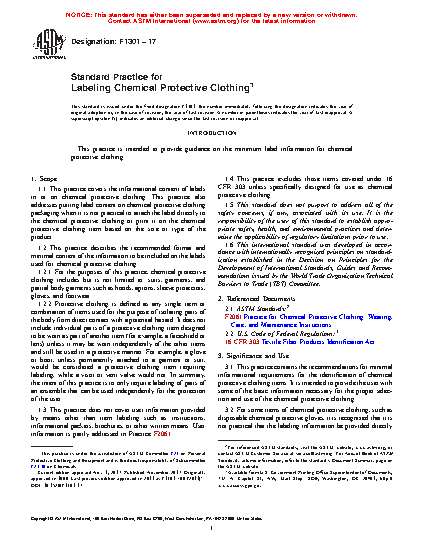 1.1 This practice covers the informational content of labels in or on chemical protective clothing.