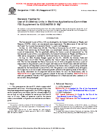 Standard Practice for Use of SI (Metric) Units in Maritime Applications (Committee F25 Supplement to IEEE/ASTM SI 10) (Withdrawn 2017)