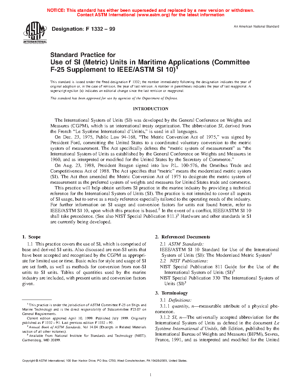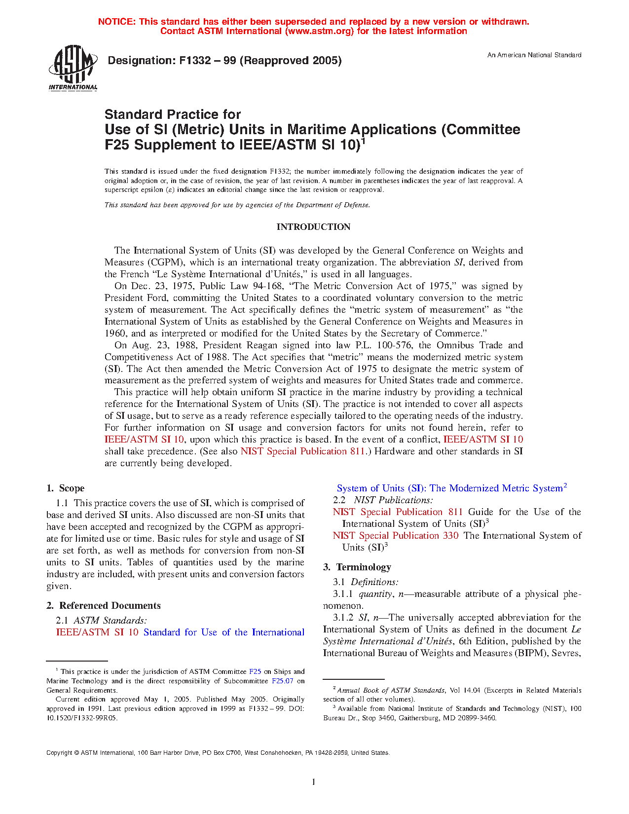 This practice covers the use of the International System of Units (SI) in maritime applications as well as non-SI units commonly used and accepted for use with SI units. This practice is intended to establish uniform SI practice in the maritime industry. Covered in this practice are the concept of SI, the two units comprising SI (namely, base and derived SI units), SI prefixes, basic rules for style and usage of SI as well as methods for rounding and conversion of non-SI units to SI units. Conversion factors for quantities commonly used in the maritime industry are also provided.