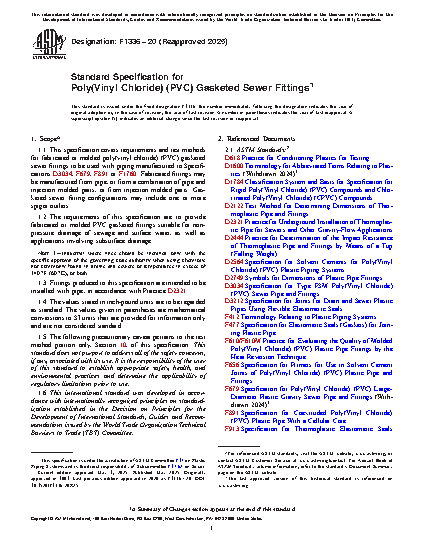 1.1 This specification covers requirements and test methods for fabricated or molded poly(vinyl chloride) (PVC) gasketed sewer fittings to be used with piping manufactured to Specifications D 3034, F 679, F 789, or F 891. Fabricated fittings may be manufactured from pipe, or from a combination of pipe and injection molded parts, or from injection molded parts.