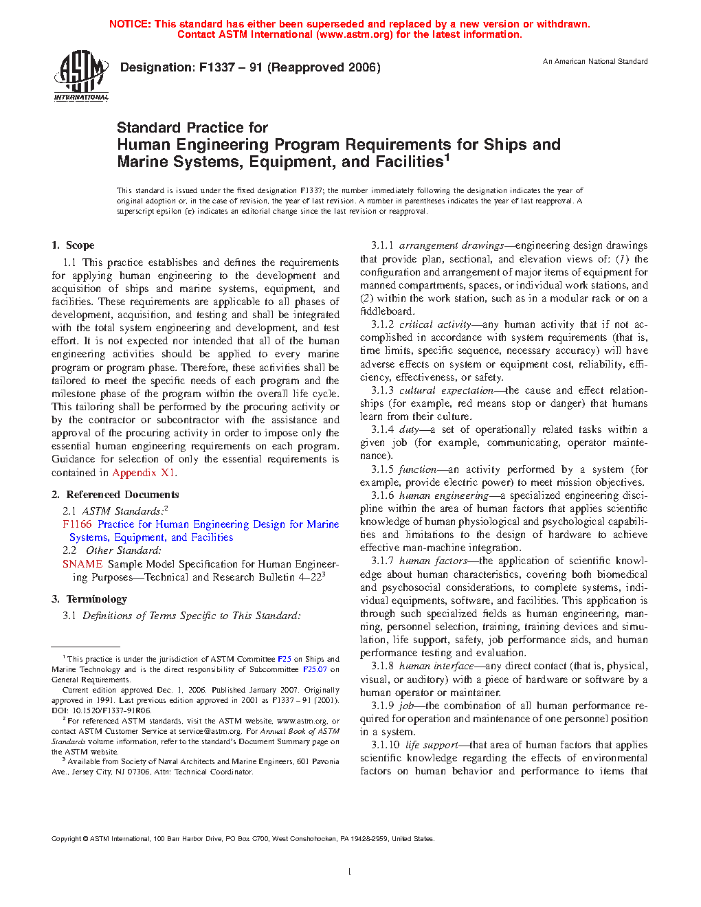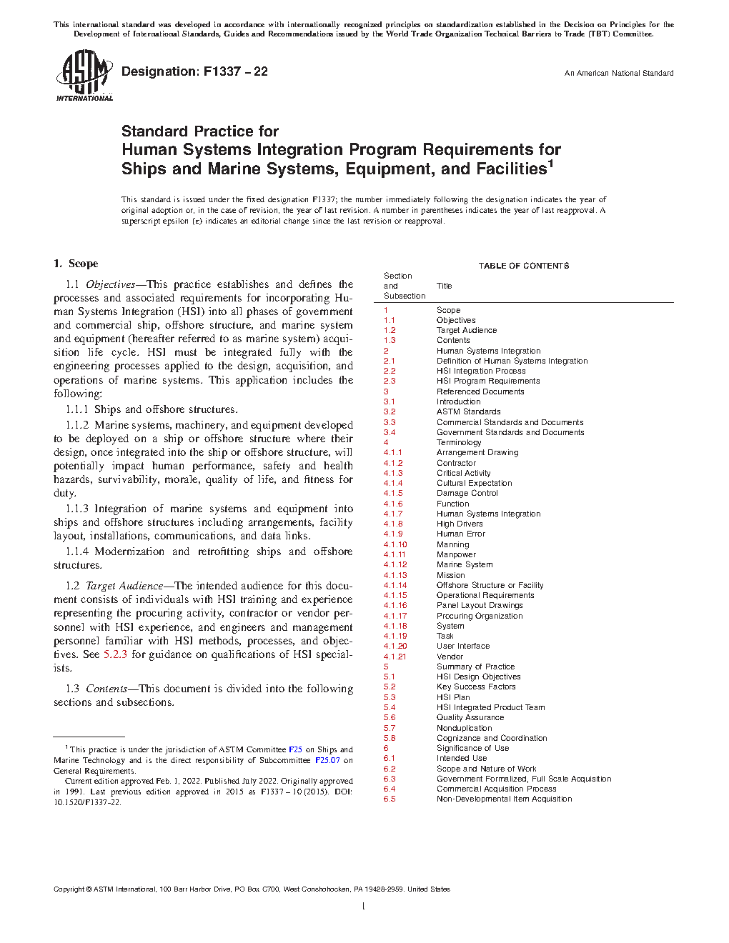 1.1 Objectives—This practice establishes and defines the processes and associated requirements for incorporating Human Systems Integration (HSI) into all phases of government and commercial ship, offshore structure, and marine system and equipment (hereafter referred to as marine system) acquisition life cycle. HSI must be integrated fully with the engineering processes applied to the design, acquisition, and operations of marine systems. This application includes the following: