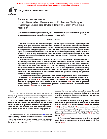 1.3 Resistance of materials used in protective clothing to permeation or penetration can be determined in accordance with Test Method F739 (or Test Method F1383 or Test Method F1407) and Test Method F903, respectively. Alternatively, resistance of materials used in protective clothing to penetration by synthetic blood or liquids containing virus can be determined in accordance with Test Method F1670 and Test Method F1671.