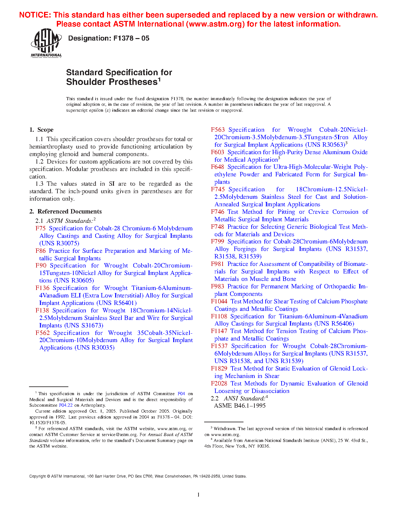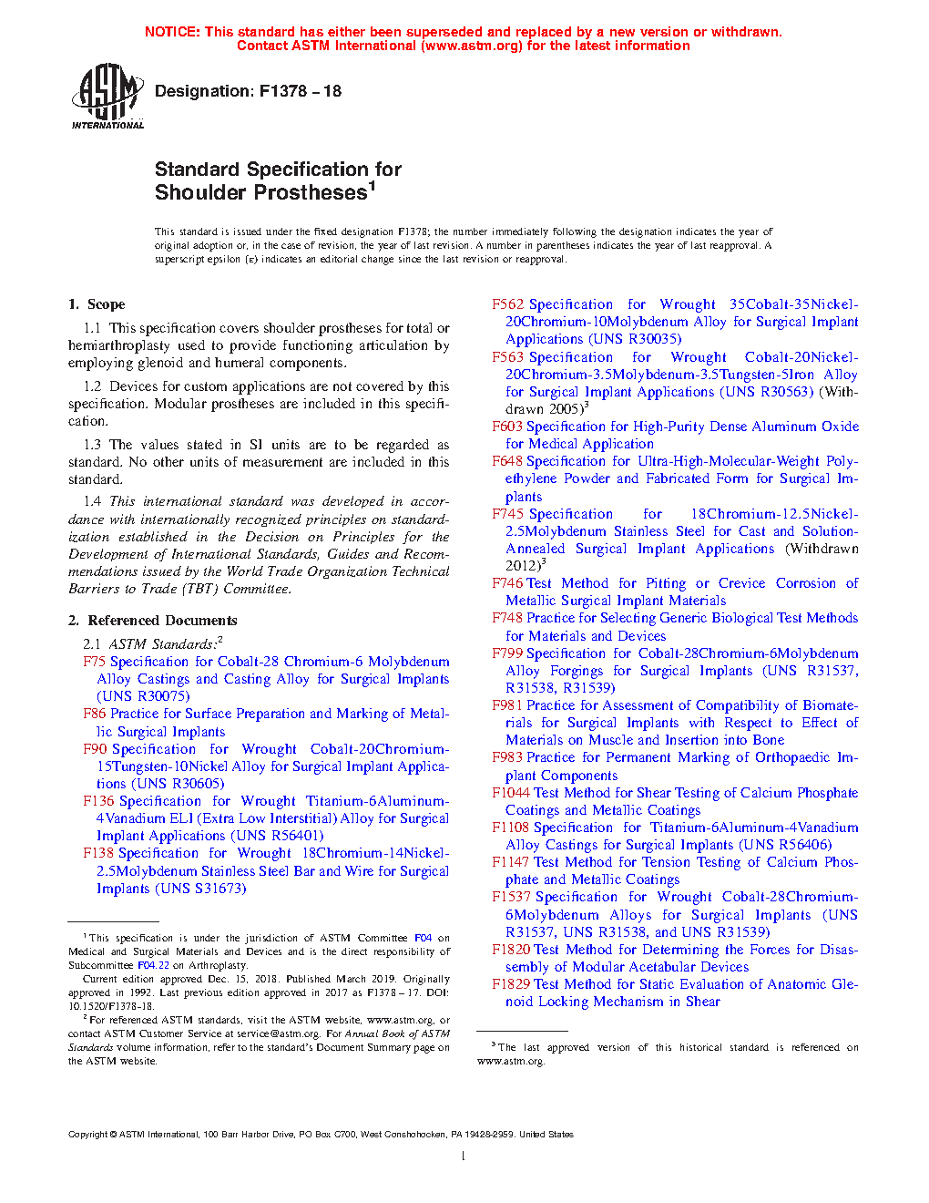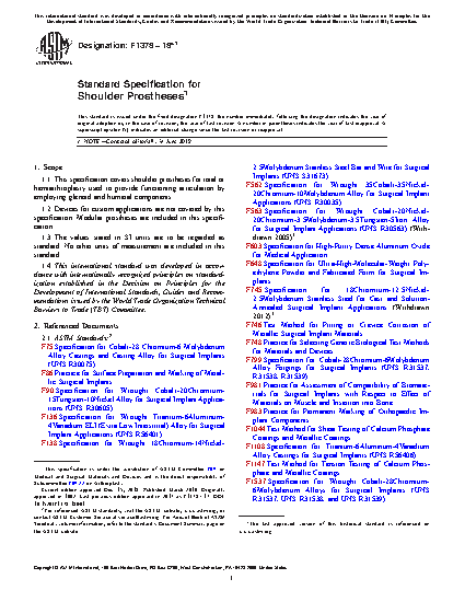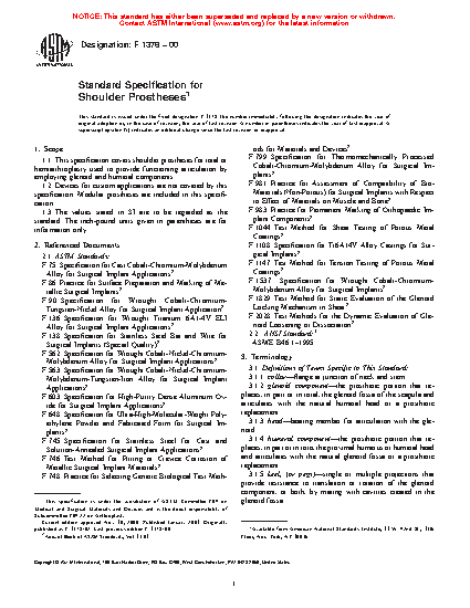 1.1 This specification covers shoulder prostheses for total or hemiarthroplasty used to provide functioning articulation by employing glenoid and humeral components.