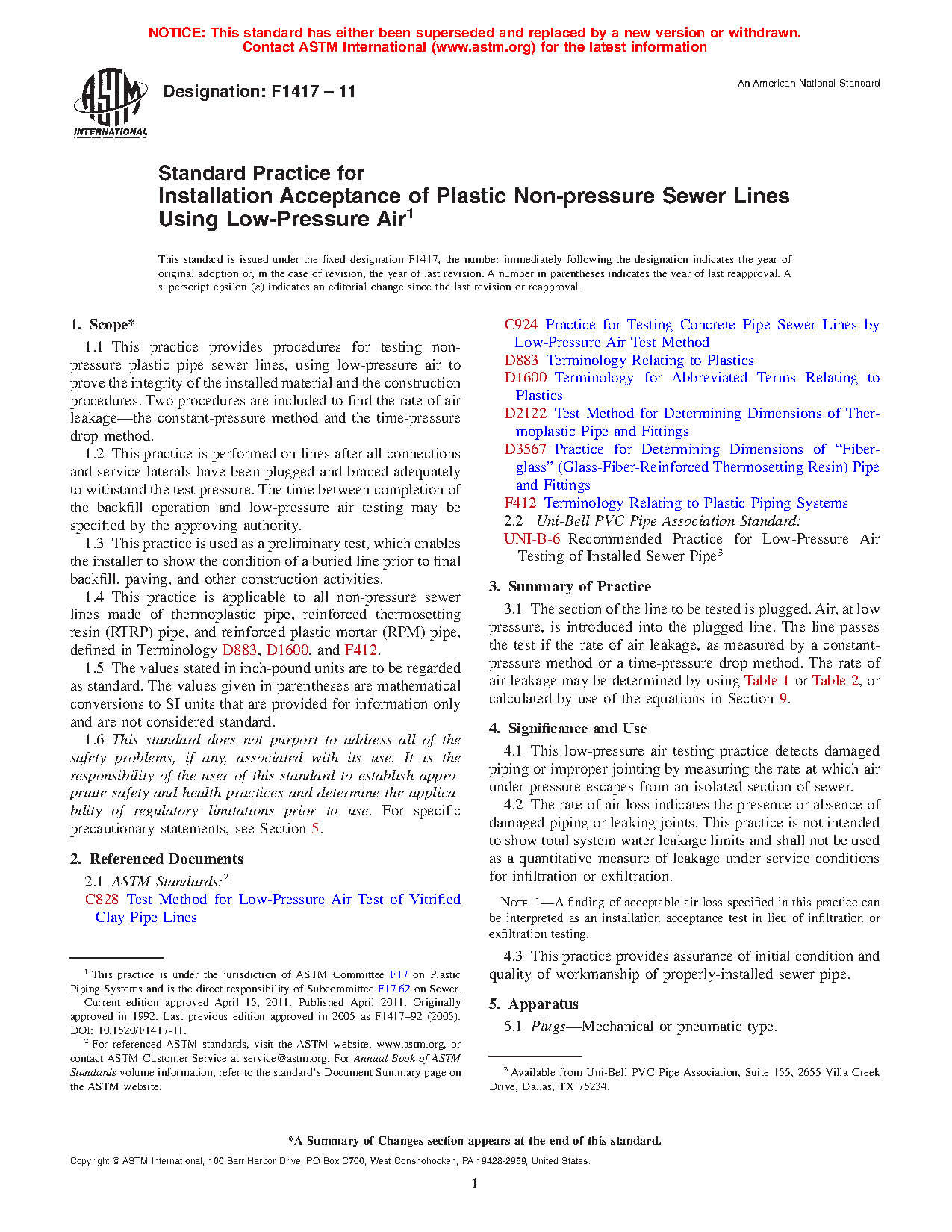 1.1 This practice provides procedures for testing non-pressure plastic pipe sewer lines, using low-pressure air to prove the integrity of the installed material and the construction procedures. Two procedures are included to find the rate of air leakage—the constant-pressure method and the time-pressure drop method.