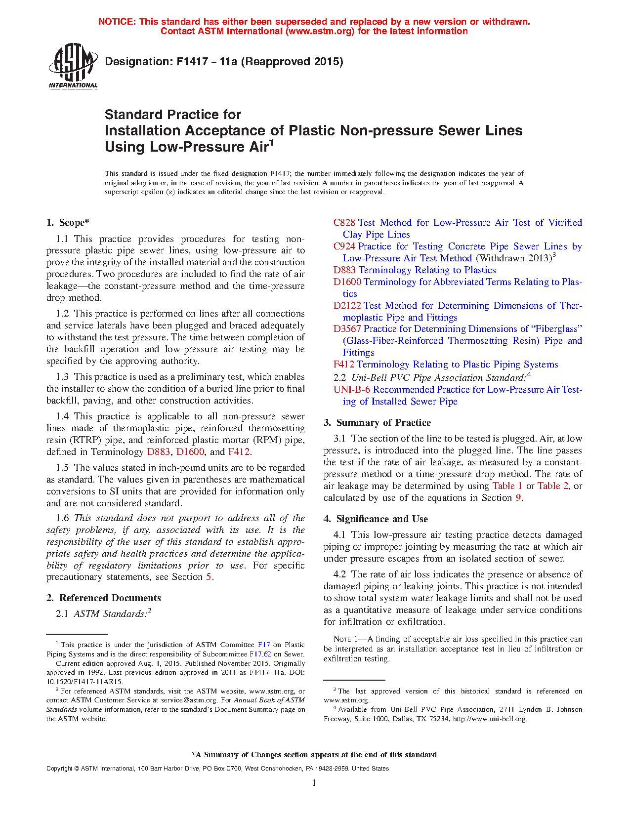 Note 1: A finding of acceptable air loss specified in this practice can be interpreted as an installation acceptance test in lieu of infiltration or exfiltration testing.