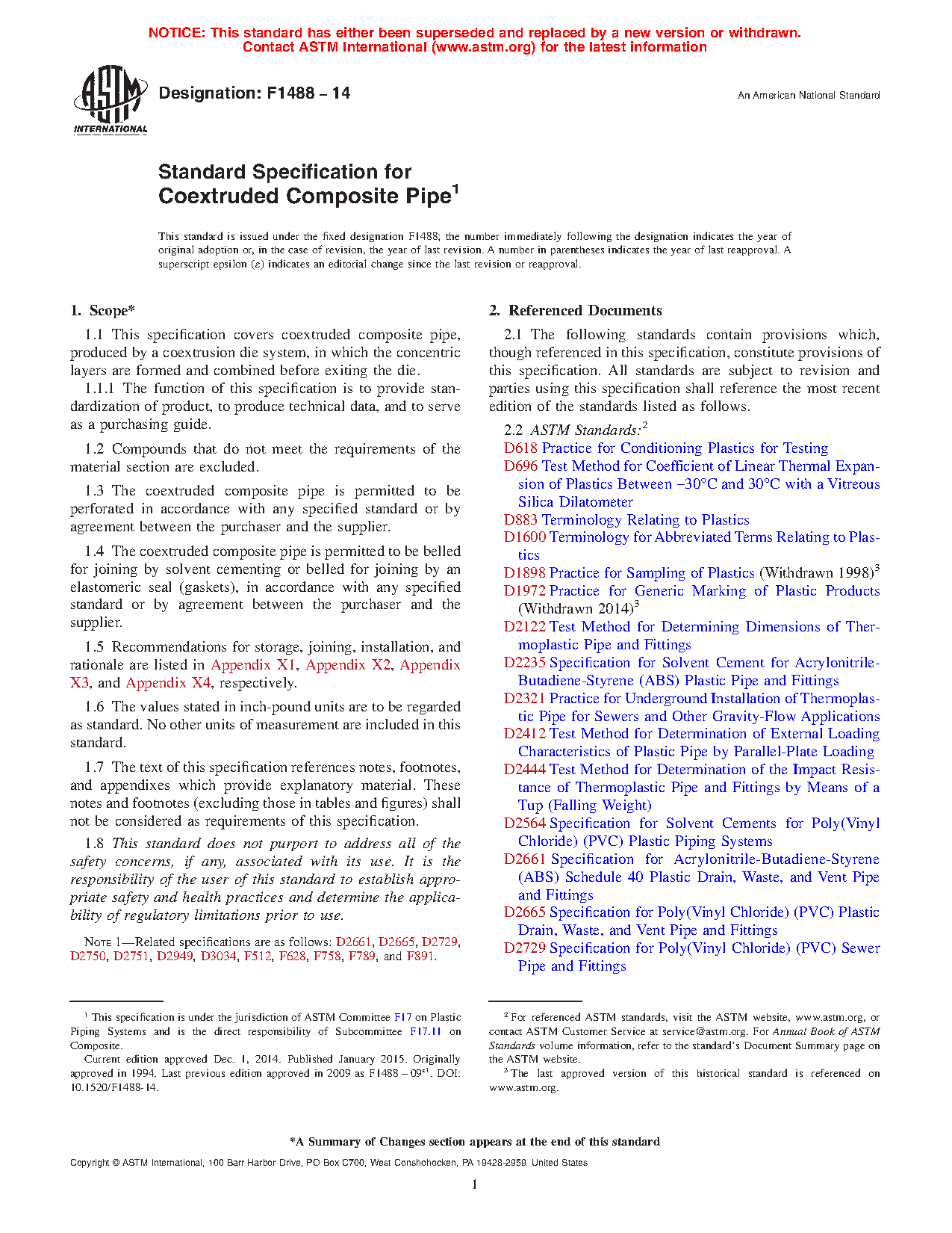 1.1Â This specification covers coextruded composite pipe, intended for non-pressure gravity flow drain waste or vent (DWV) service, or plastic underdrain service, or electrical or comunications conduit service produced by a coextrusion die system, in which the concentric layers are formed and combined before exiting the die.