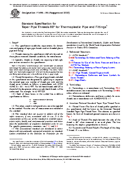 1.1 This specification establishes requirements for dimensions and gaging of taper pipe threads used on threaded plastic pipe and fittings.