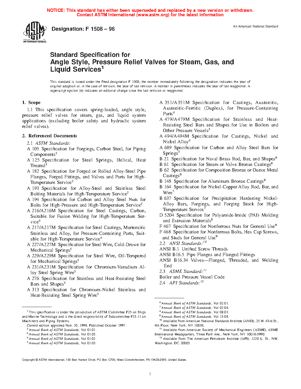 1.1 This specification covers spring-loaded, angle style, pressure relief valves for steam, gas, and liquid system applications (excluding boiler safety and hydraulic system relief valves).