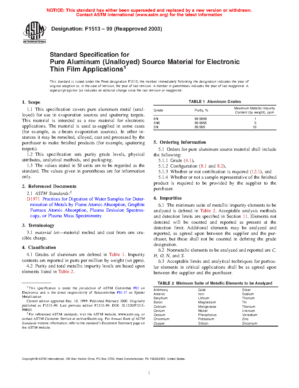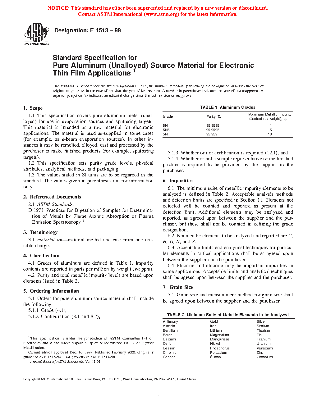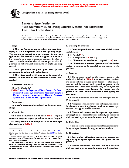 1.1 This specification covers pure aluminum metal (unalloyed) for use in evaporation sources and sputtering targets. This material is intended as a raw material for electronic applications. The material is used as-supplied in some cases (for example, as e-beam evaporation sources). In other instances it may be remelted, alloyed, cast and processed by the purchaser to make finished products (for example, sputtering targets).
