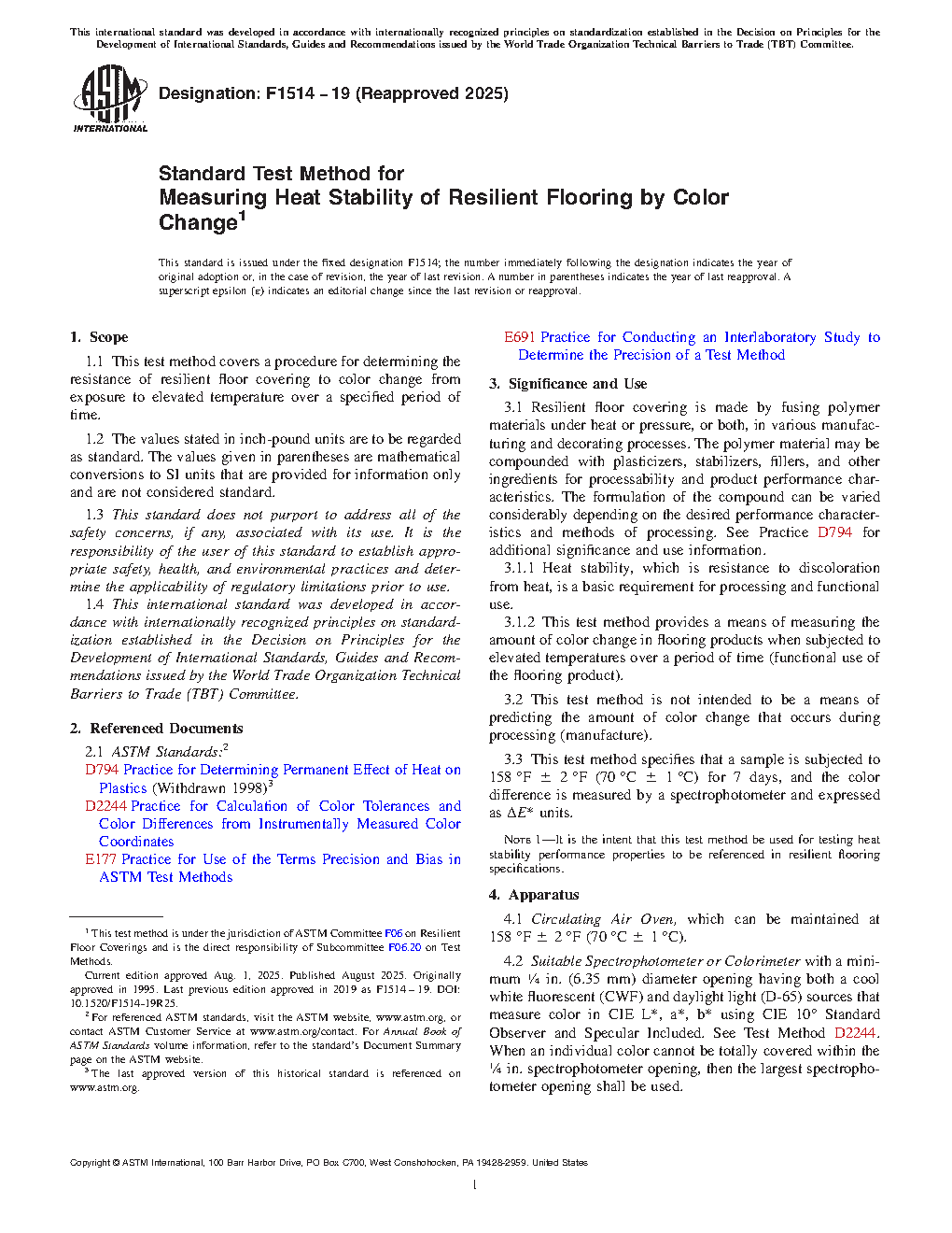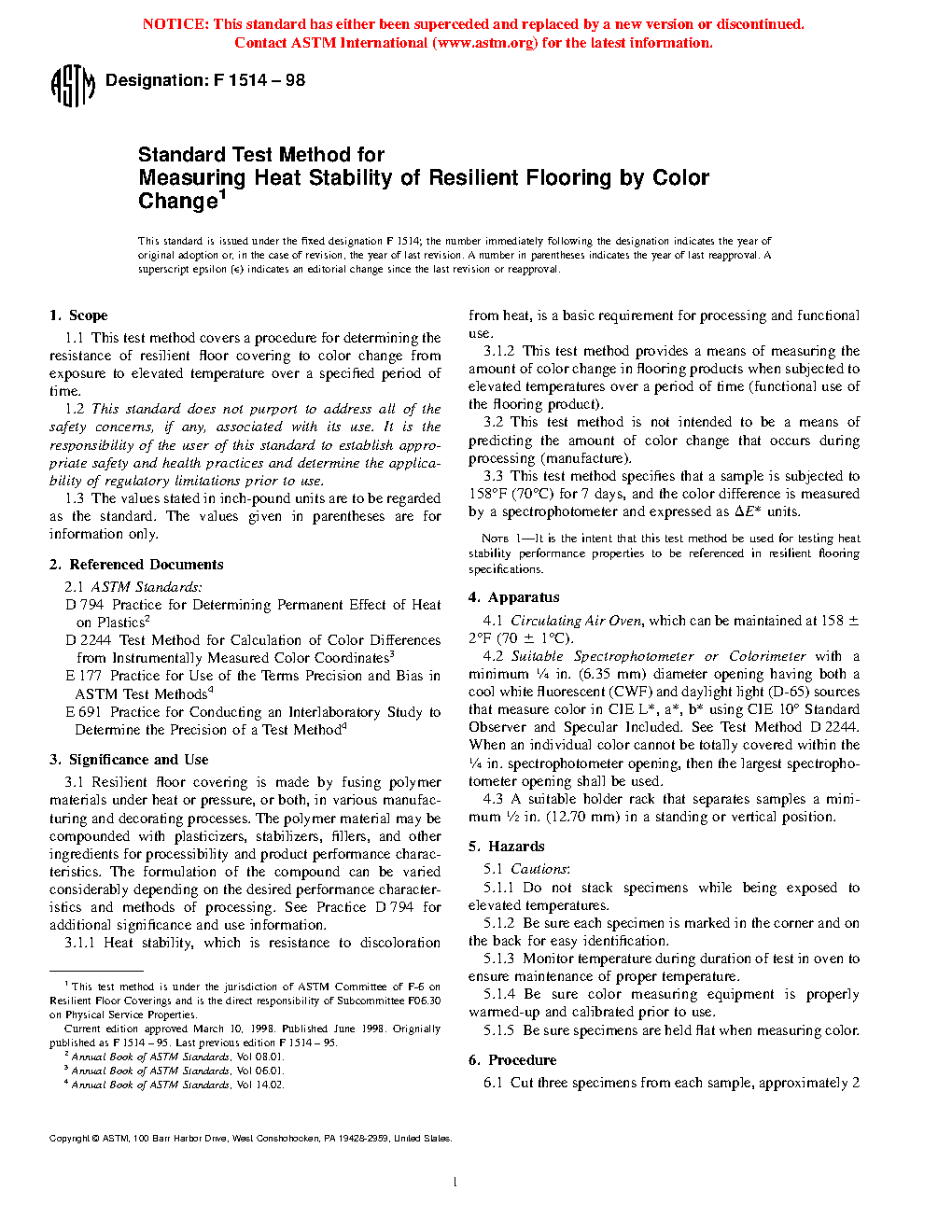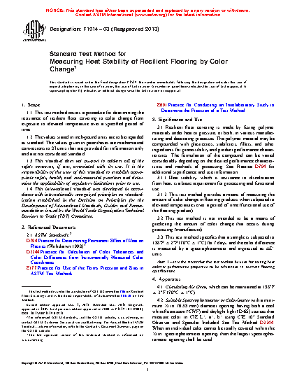 1.1 This test method covers a procedure for determining the resistance of resilient floor covering to color change from exposure to elevated temperature over a specified period of time.