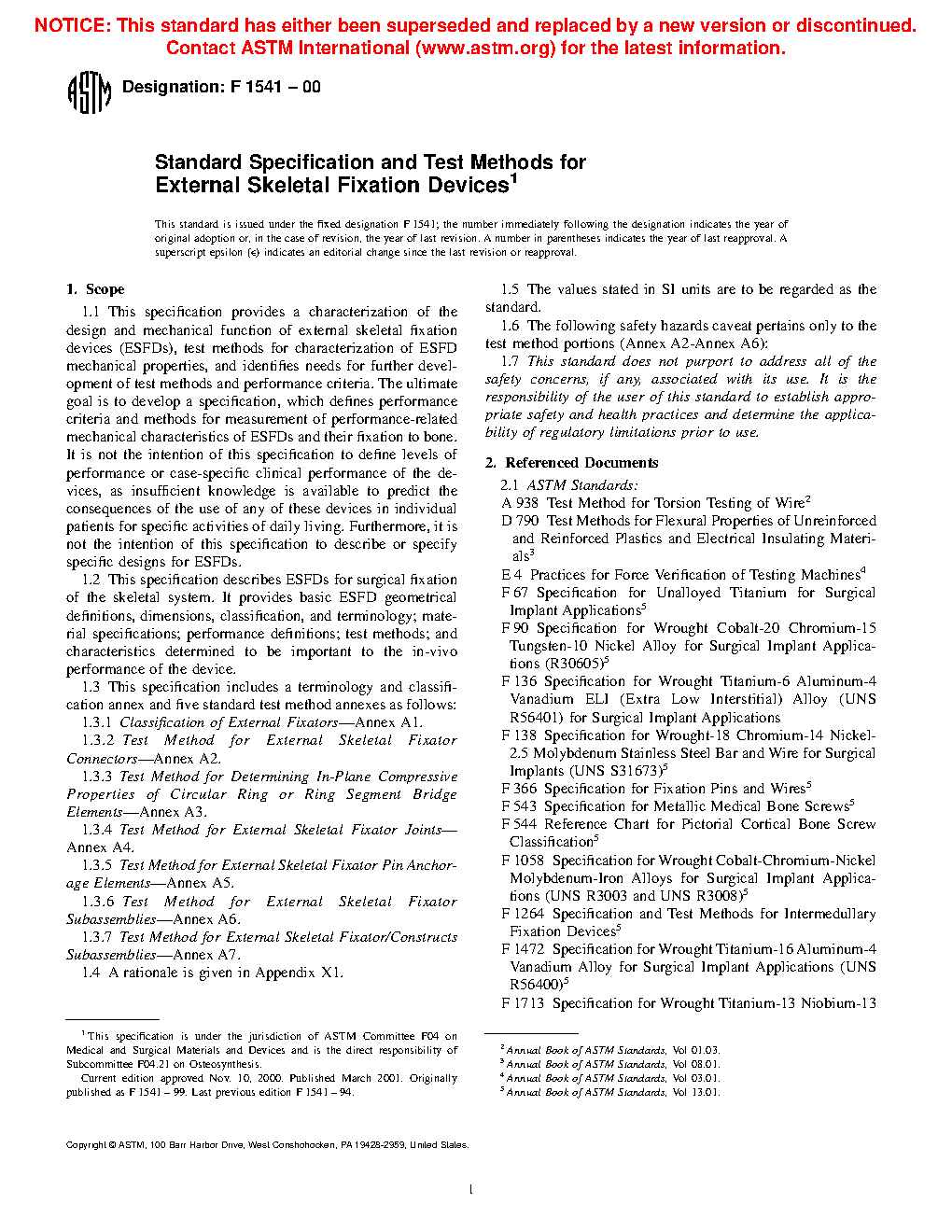 1.2 This specification describes ESFDs for surgical fixation of the skeletal system. It provides basic ESFD geometrical definitions, dimensions, classification, and terminology; material specifications; performance definitions; test methods; and characteristics determined to be important to the in-vivo performance of the device.