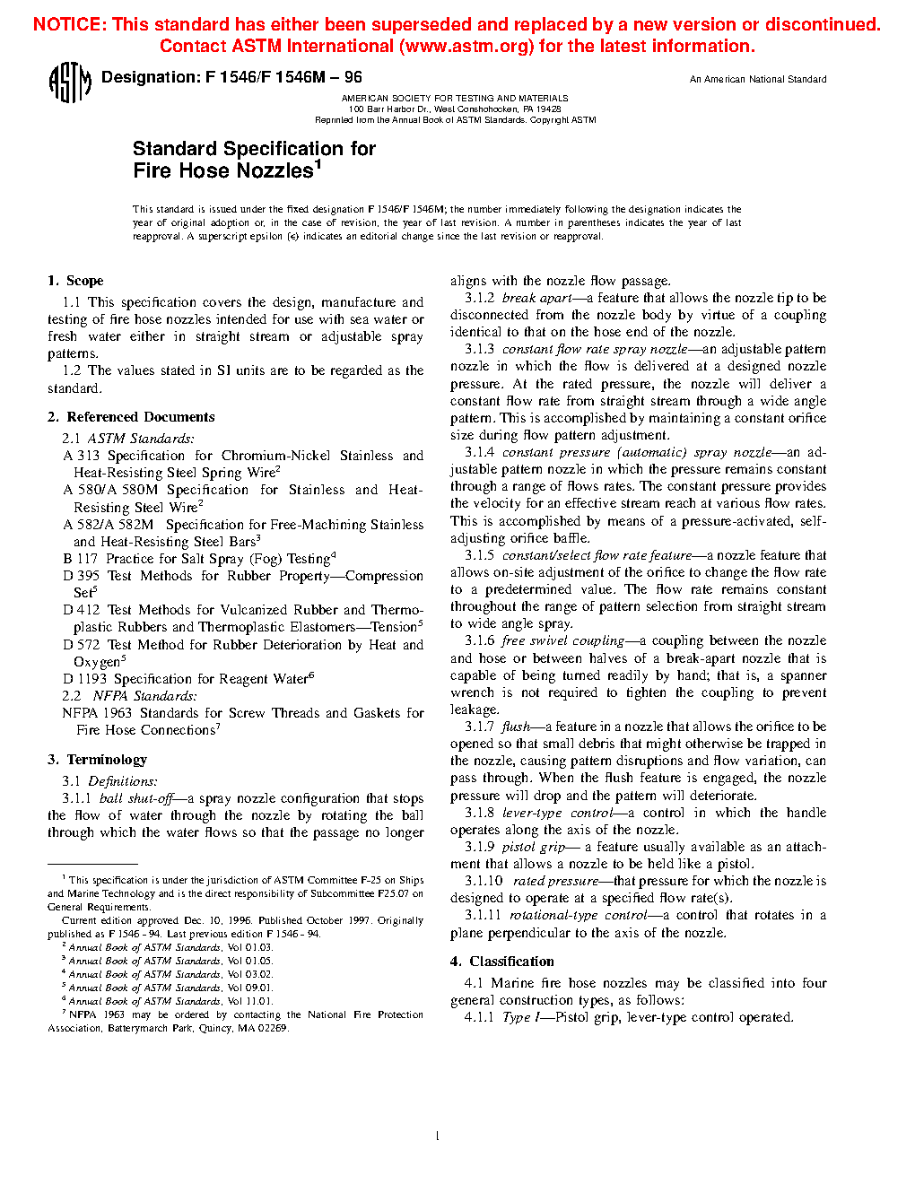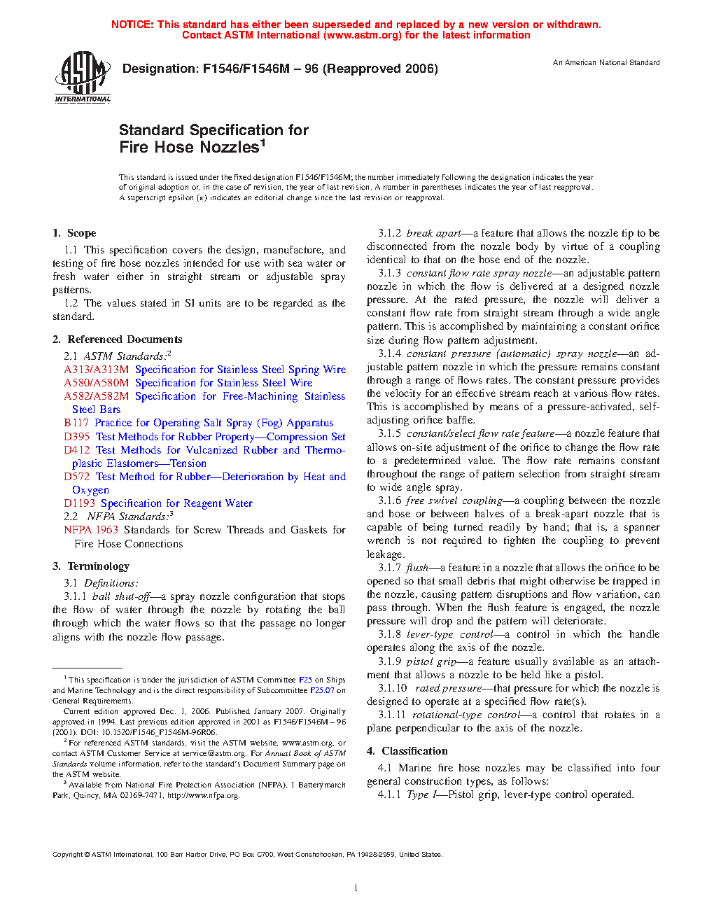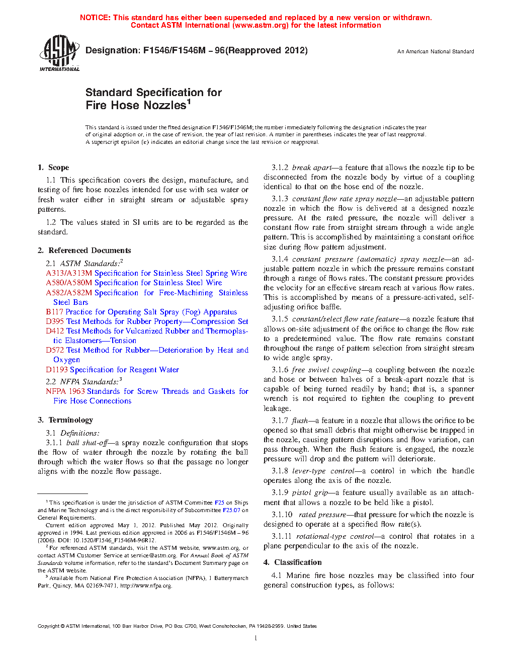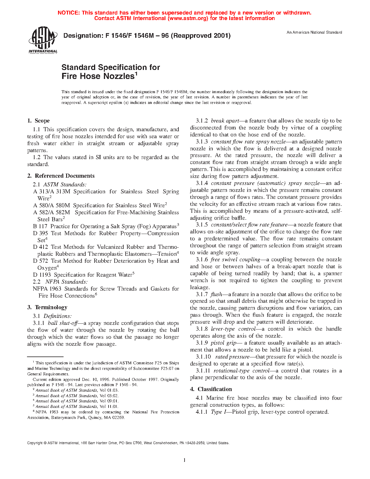 1.1 This specification covers the design, manufacture and testing of fire hose nozzles intended for use with sea water or fresh water either in straight stream or adjustable spray patterns.