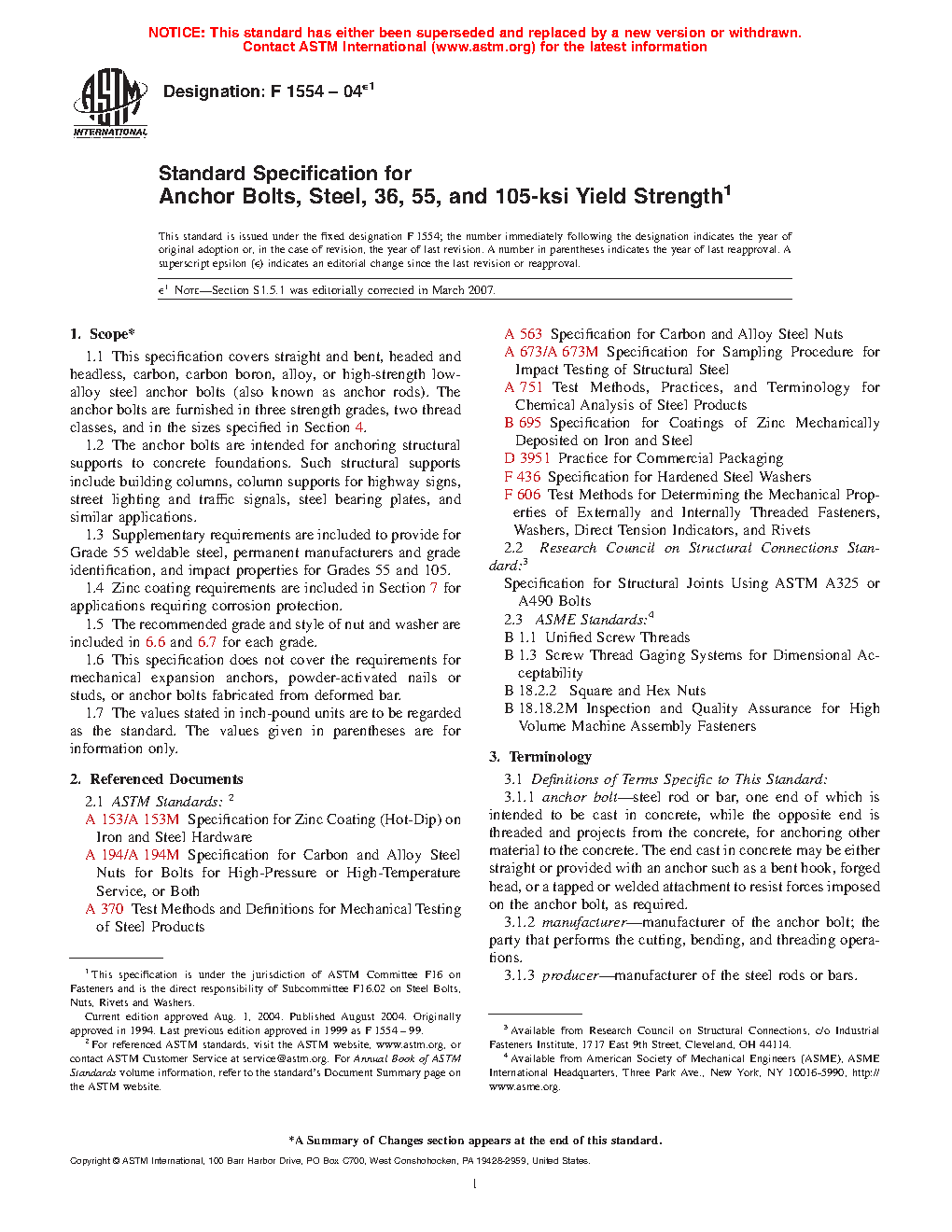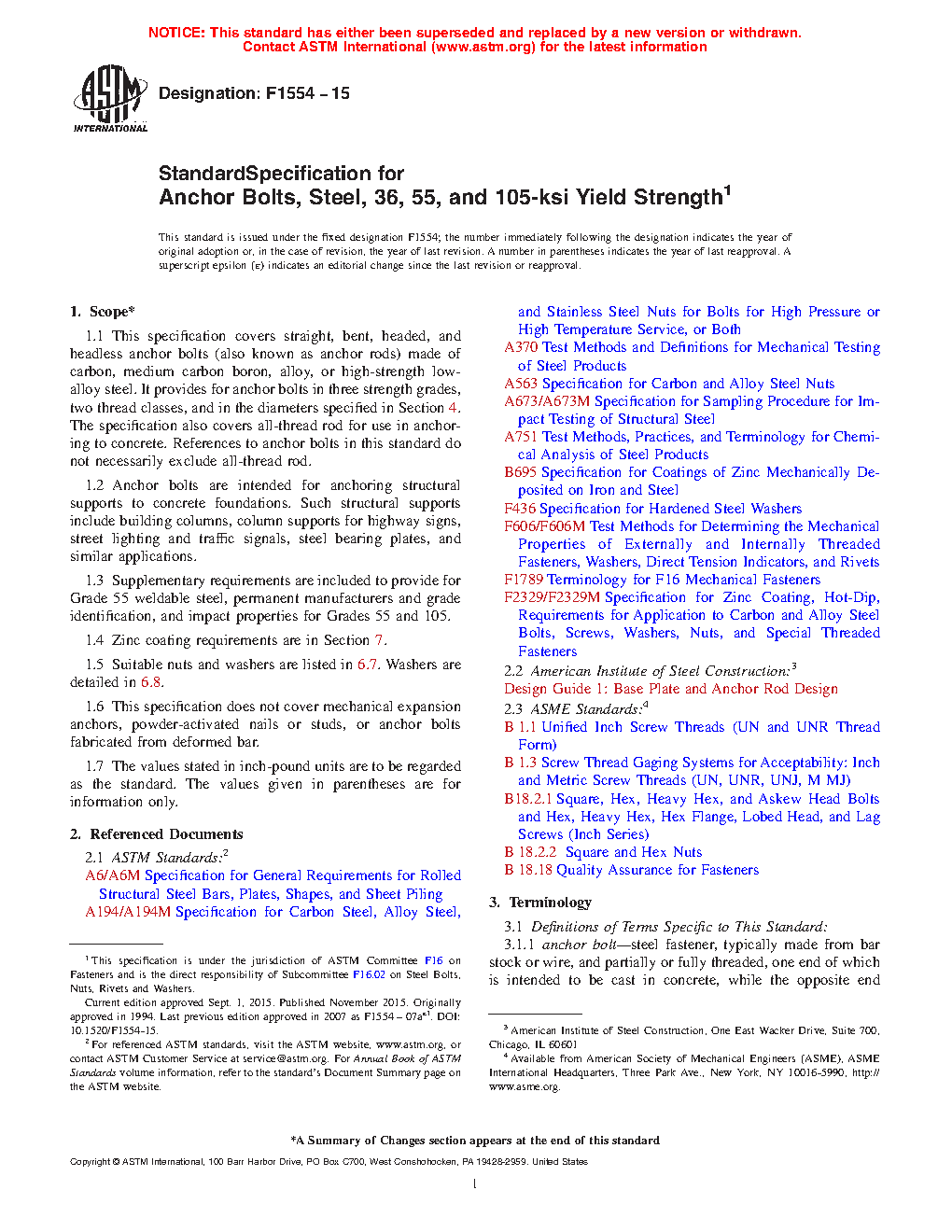 This specification covers the chemical, mechanical, and dimensional requirements, and associated test methods for straight and bent, headed and headless anchor bolts (also known as anchor rods) made of carbon, carbon boron, alloy, or high-strength low-alloy steel and having specified yield strengths. The anchor bolts are furnished in three strength grades, two thread classes, and various sizes, and are intended for anchoring structural supports to concrete foundations such as building columns, column supports for highway signs, street lighting and traffic signals, steel bearing plates, and similar applications. This specification, however, does not cover the requirements for mechanical expansion anchors, powder-activated nails or studs, and anchor bolts fabricated from deformed bars. The bolts shall adhere to specified elemental chemical compositions as examined by heat and product analysis. They shall also be tested for their conformance with mechanical properties such as tensile strength, yield strength, elongation, reduction of area, and stress area. The anchor bolts shall also meet specified values for nominal size, body diameter, bend section, length, bend angle, and coated length.