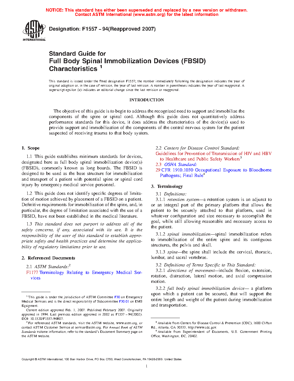1.1 This guide establishes minimum standards for devices, designated here as full body spinal immobilization device(s) (FBSID), commonly known as long boards. The FBSID is designed to be used as the base structure for immobilization and transport of a patient with potential spine or spinal cord injury by emergency medical service personnel.