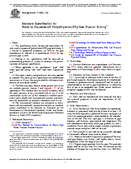 1.1 This specification covers the physical requirements for tools used to squeeze-off polyethylene (PE) pipe and tubing. It is limited to squeeze-off procedures set forth by the pipe manufacturer as referred to in Specification D2513 for gas pressure pipe systems.
