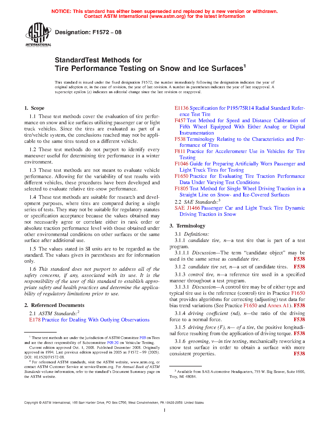 These test methods describe techniques for assessing the performance characteristics of tires in a winter environment on snow and ice surfaces in a standardized manner. When only snow is referred to hereafter, it should be understood that ice is implied as appropriate.
