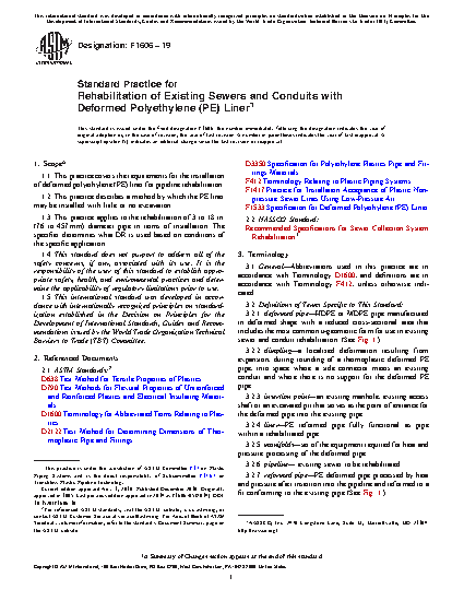 1.1 This practice covers the requirements for the installation of deformed polyethylene (PE) liner for pipeline rehabilitation.