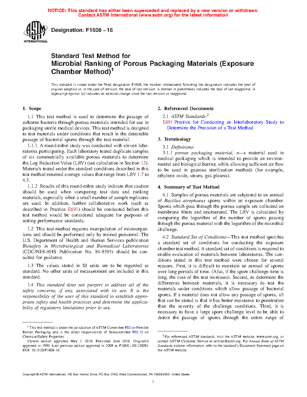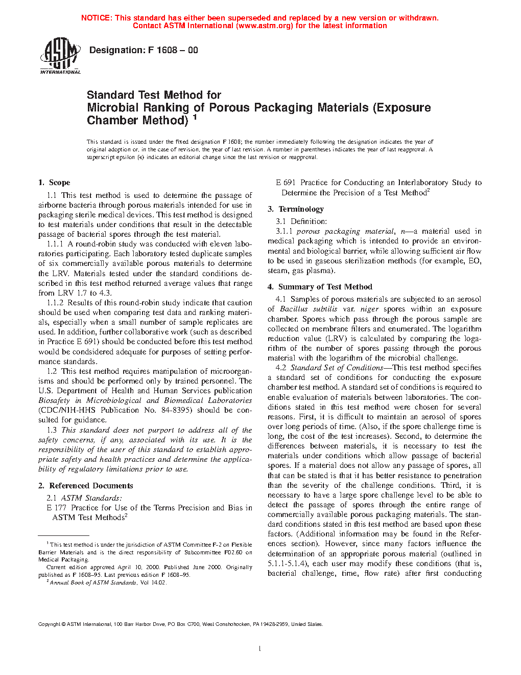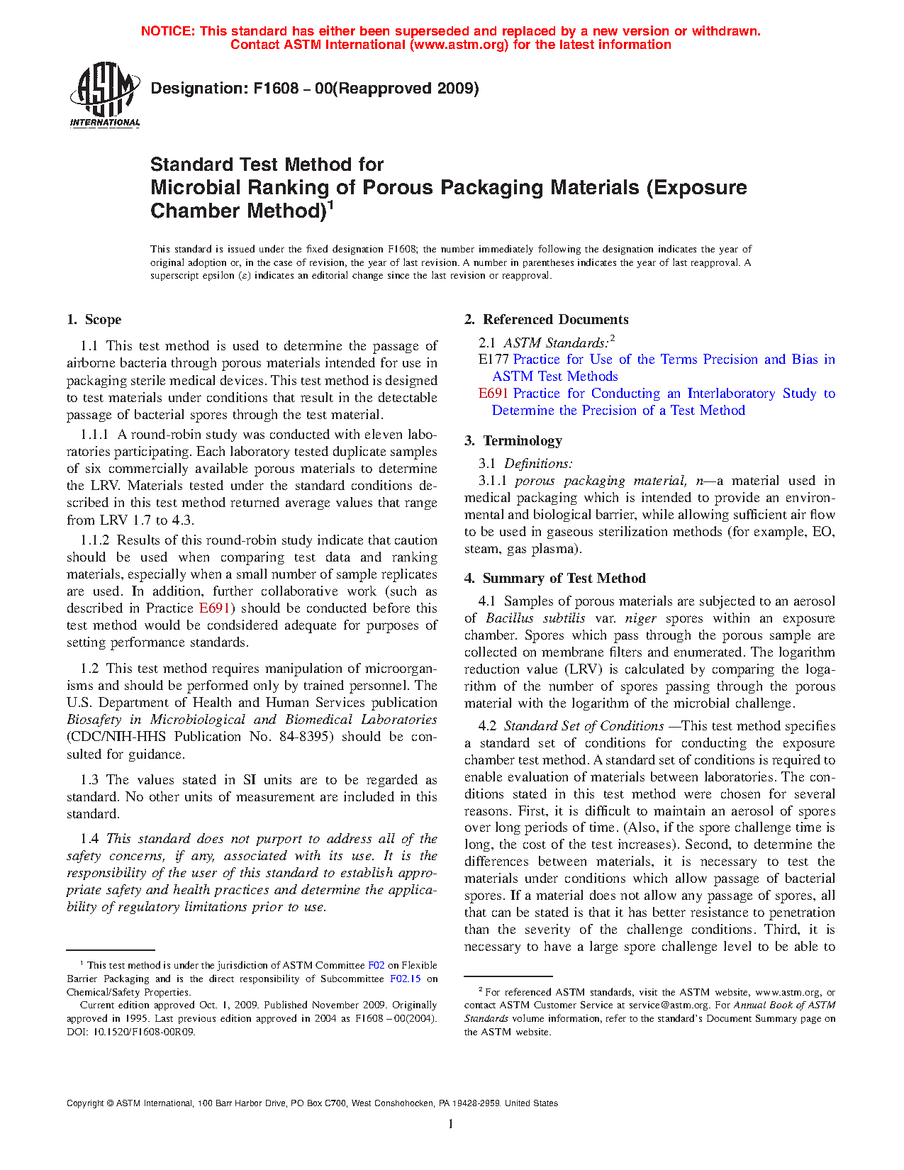 1.1 This test method is used to determine the passage of airborne bacteria through porous materials intended for use in packaging sterile medical devices. This test method is designed to test materials under conditions that result in the detectable passage of bacterial spores through the test material.