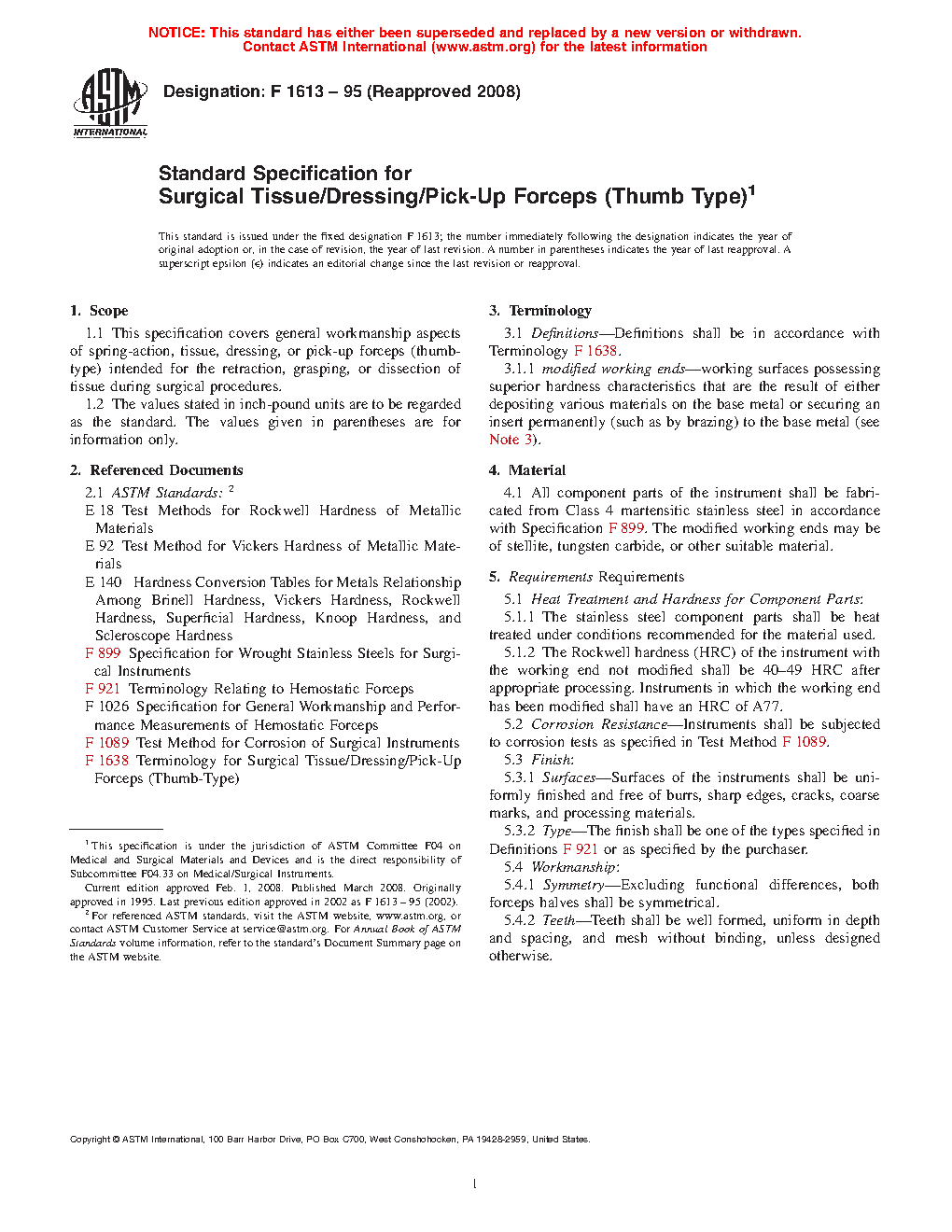 1.1 This specification covers general workmanship aspects of spring-action, tissue, dressing, or pick-up forceps (thumb-type) intended for the retraction, grasping, or dissection of tissue during surgical procedures.