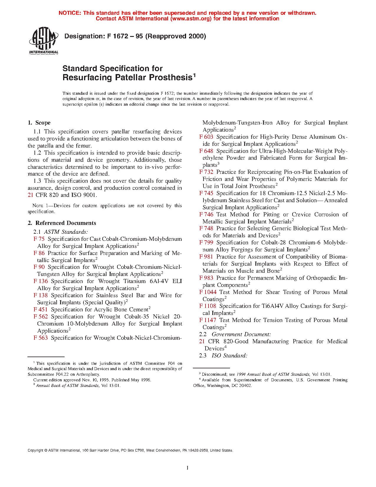 1.1 This specification covers patellar resurfacing devices used to provide a functioning articulation between the bones of the patella and the femur.