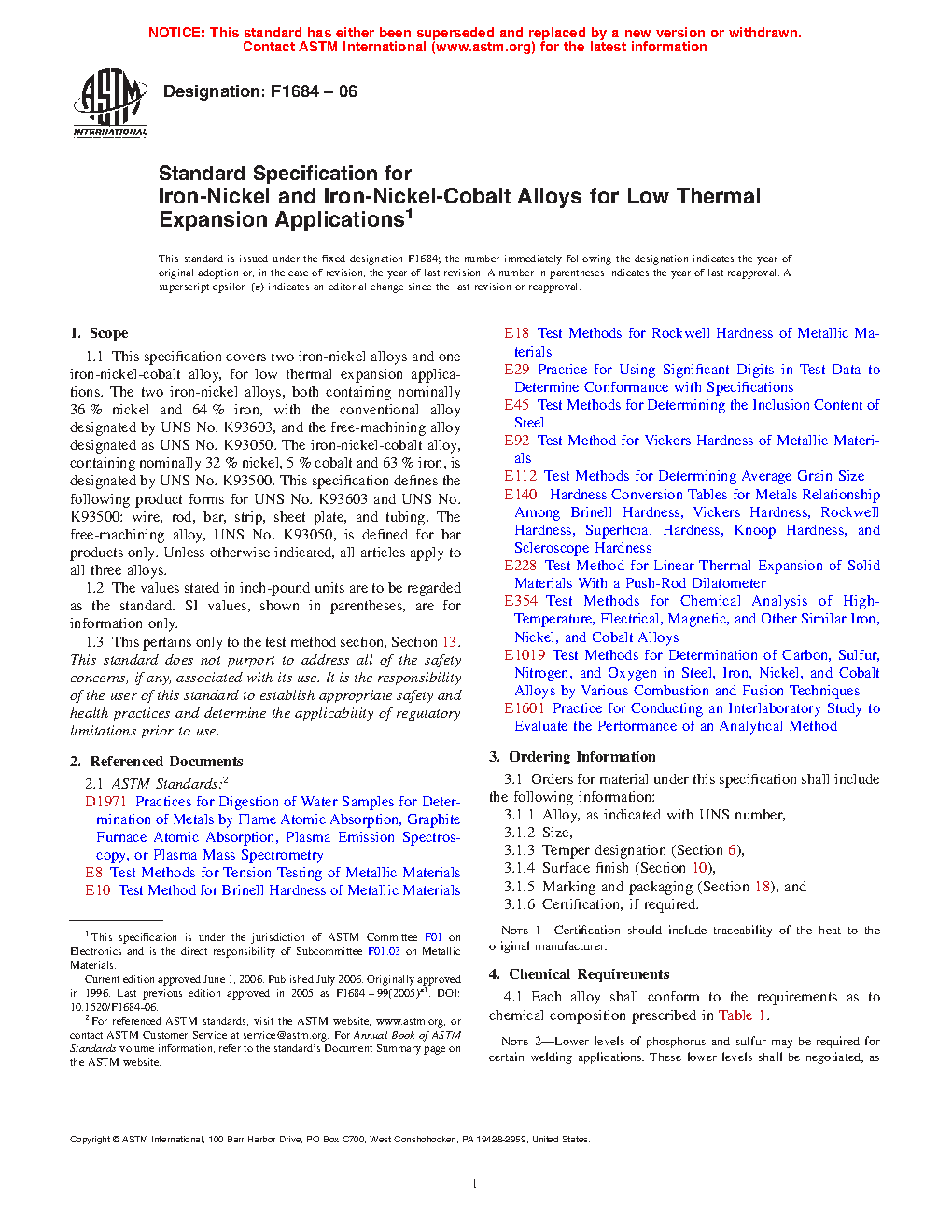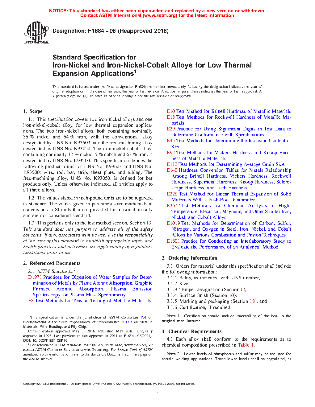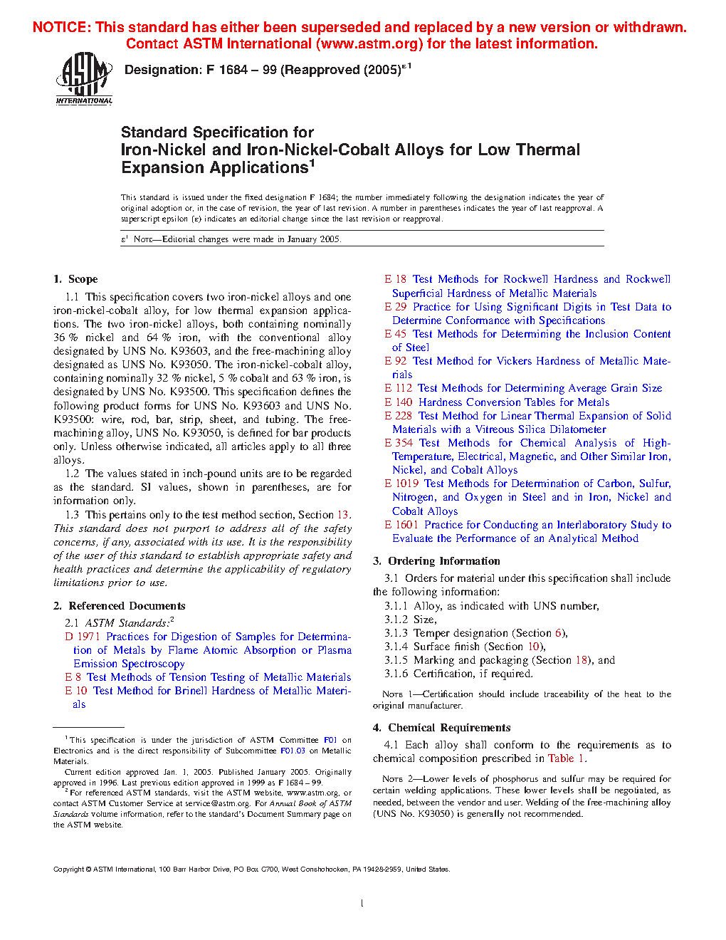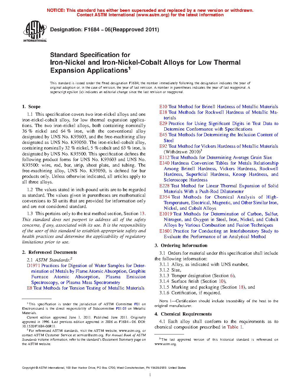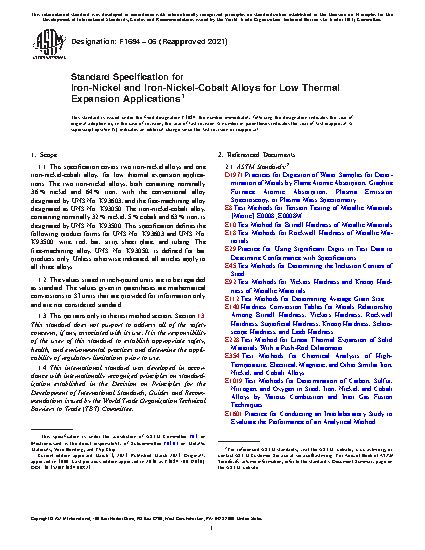 1.1 This specification covers two iron-nickel alloys and one iron-nickel-cobalt alloy, for low thermal expansion applications. The two iron-nickel alloys, both containing nominally 36% nickel and 64% iron, with the conventional alloy designated by UNS No. K93603, and the free-machining alloy designated as UNS No. K93050. The iron-nickel-cobalt alloy, containing nominally 32% nickel, 5% cobalt and 63% iron, is designated by UNS No. K93500. This specification defines the following product forms for UNS No. K93603 and UNS No. K93500: wire, rod, bar, strip, sheet, and tubing. The free-machining alloy, UNS No. K93050, is defined for bar products only. Unless otherwise indicated, all articles apply to all three alloys.