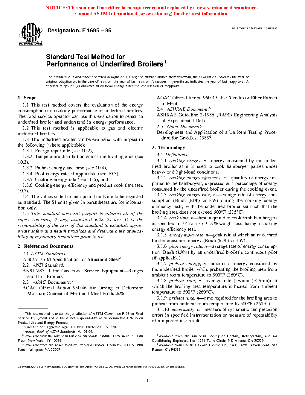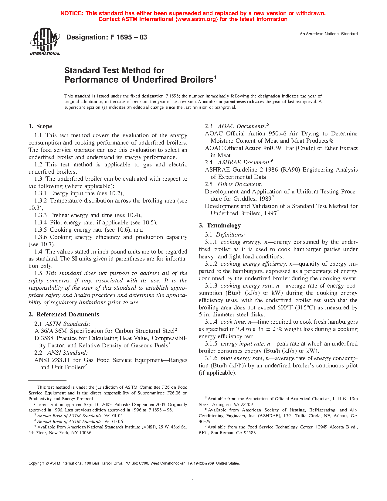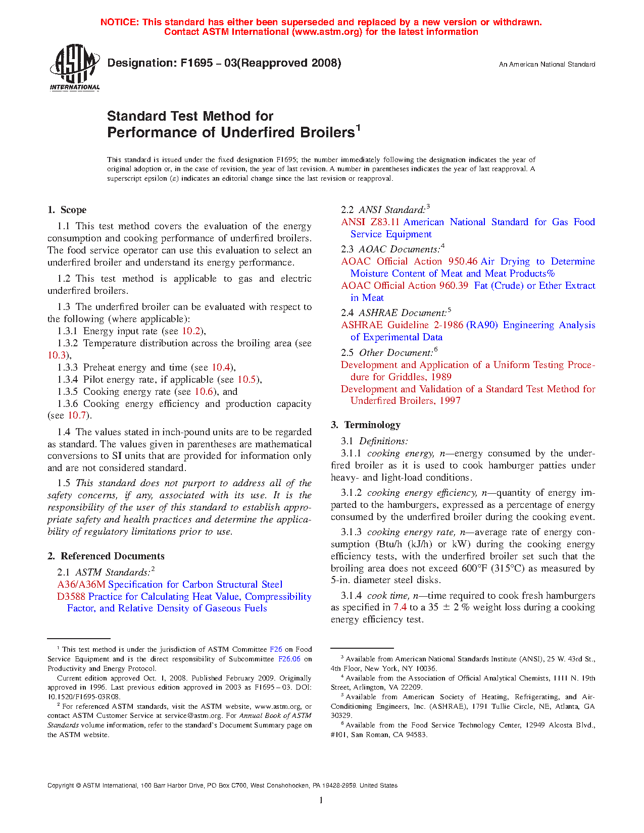 1.1 This test method covers the evaluation of the energy consumption and cooking performance of underfired broilers. The food service operator can use this evaluation to select an underfired broiler and understand its energy performance.