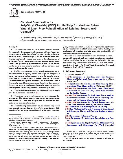 1.1 This specification covers requirements and test methods for materials, dimensions, workmanship, stiffness factor, extrusion quality, and a form of marking for extruded poly(vinyl chloride) (PVC) profile strips used for machinemade field fabrication of spirally wound pipe liners in the rehabilitation of a variety of gravity applications such as sanitary sewers, storm sewers, and process piping in diameters of 6 to 48 in.