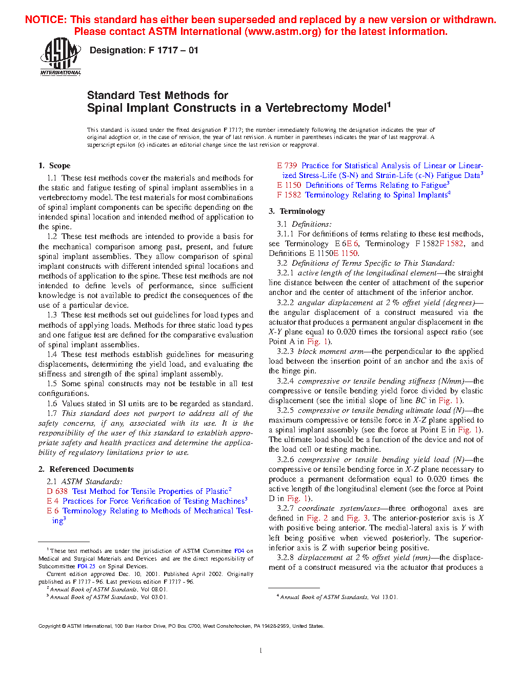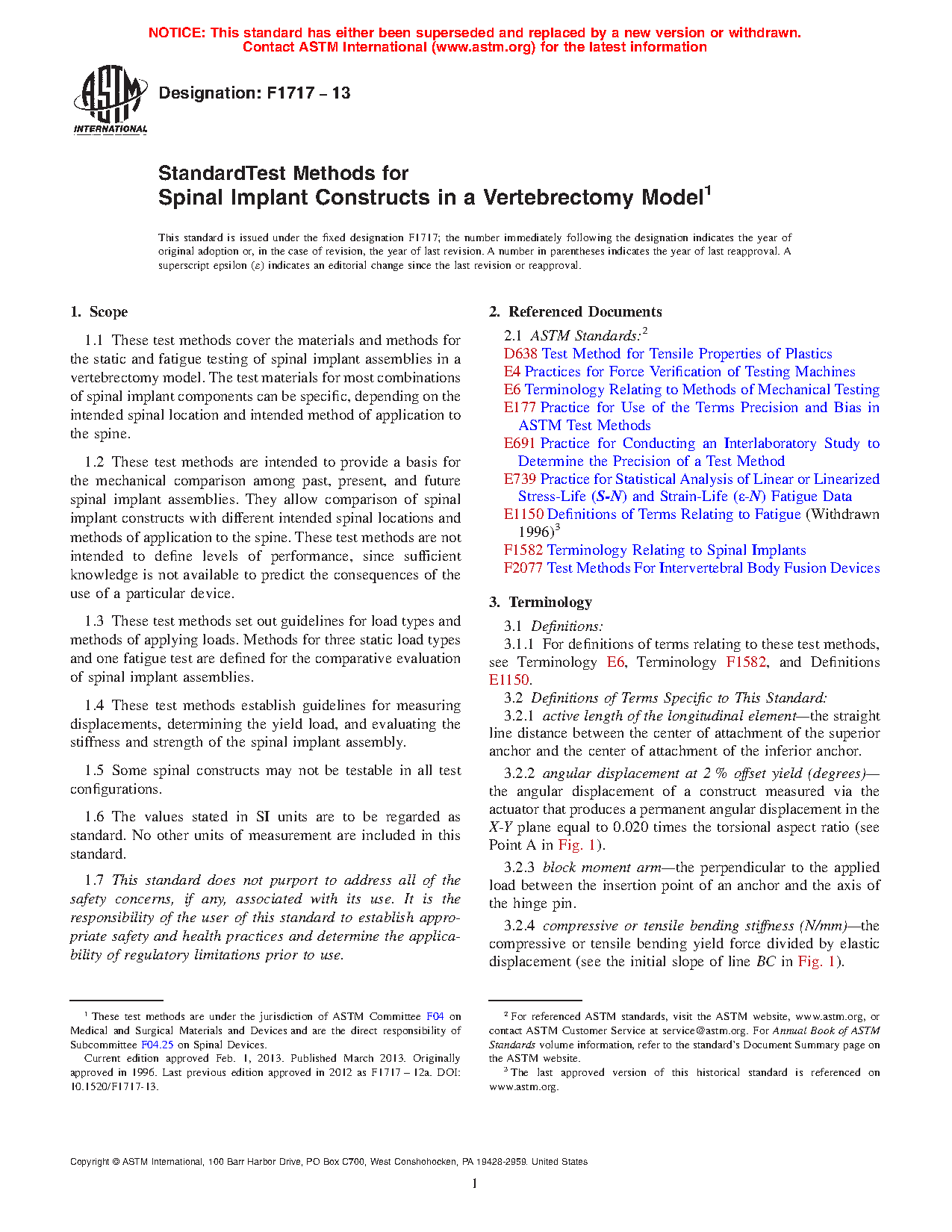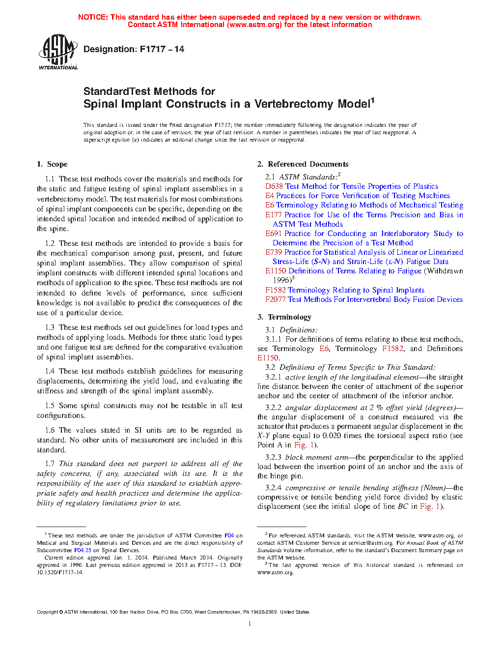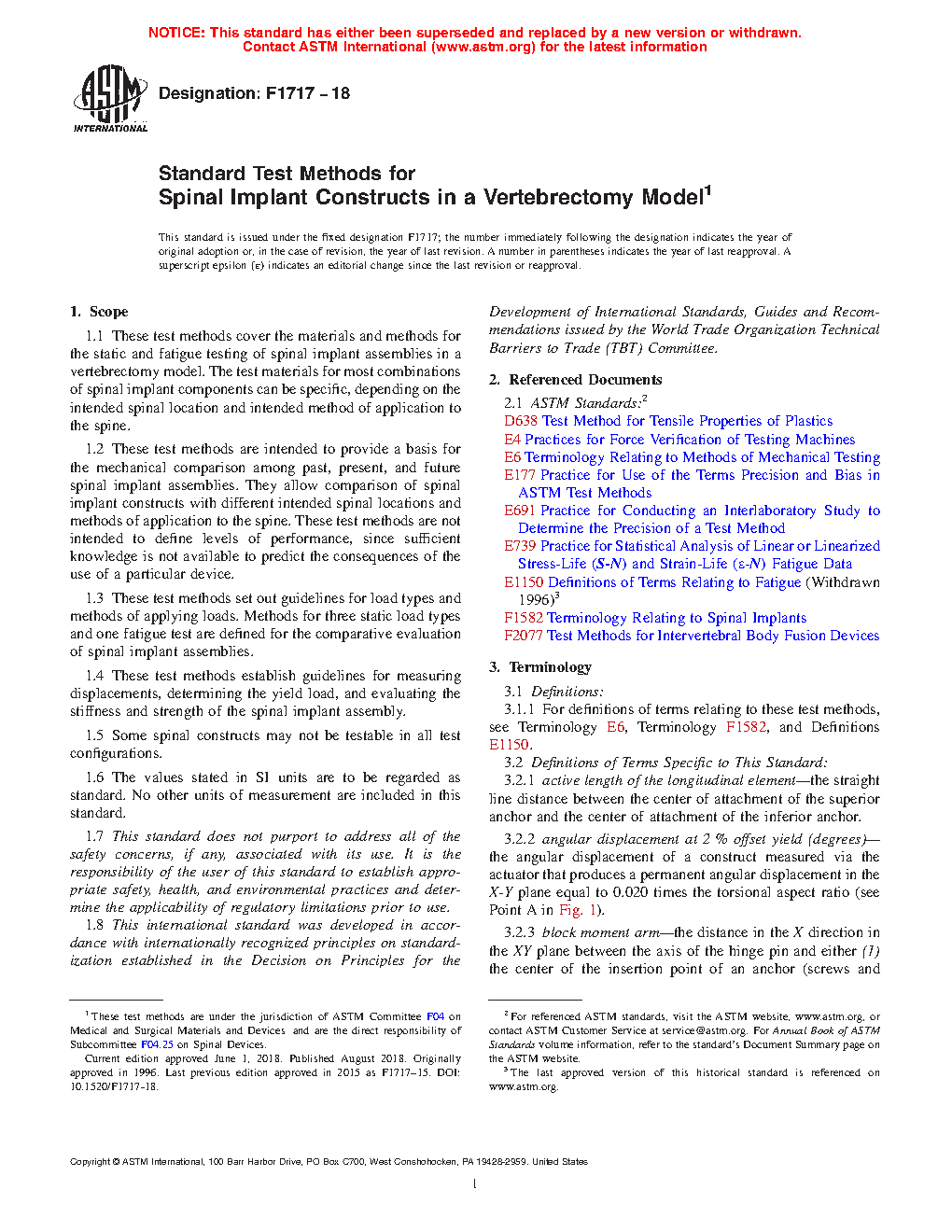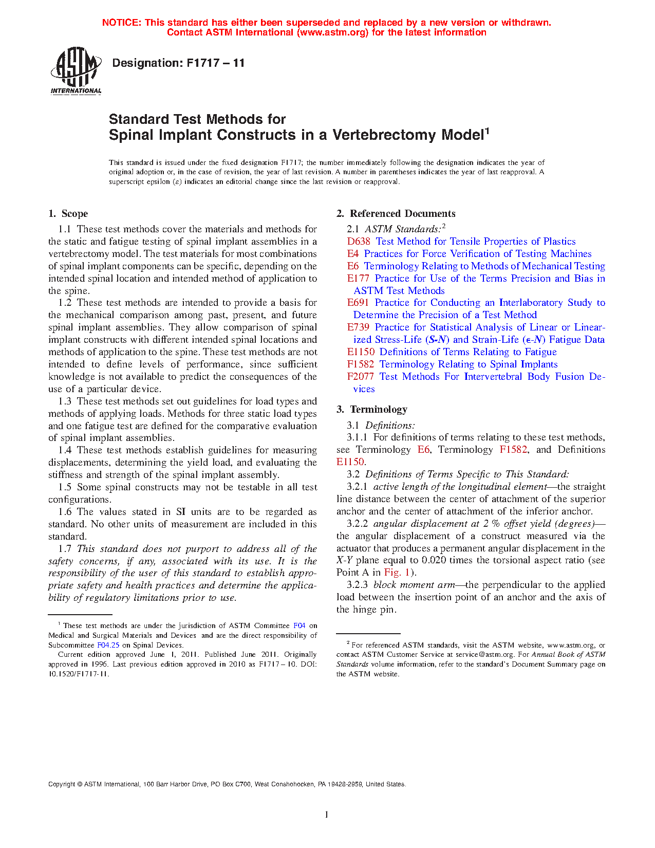 1.2 These test methods are intended to provide a basis for the mechanical comparison among past, present, and future spinal implant assemblies. They allow comparison of spinal implant constructs with different intended spinal locations and methods of application to the spine. These test methods are not intended to define levels of performance, since sufficient knowledge is not available to predict the consequences of the use of a particular device.