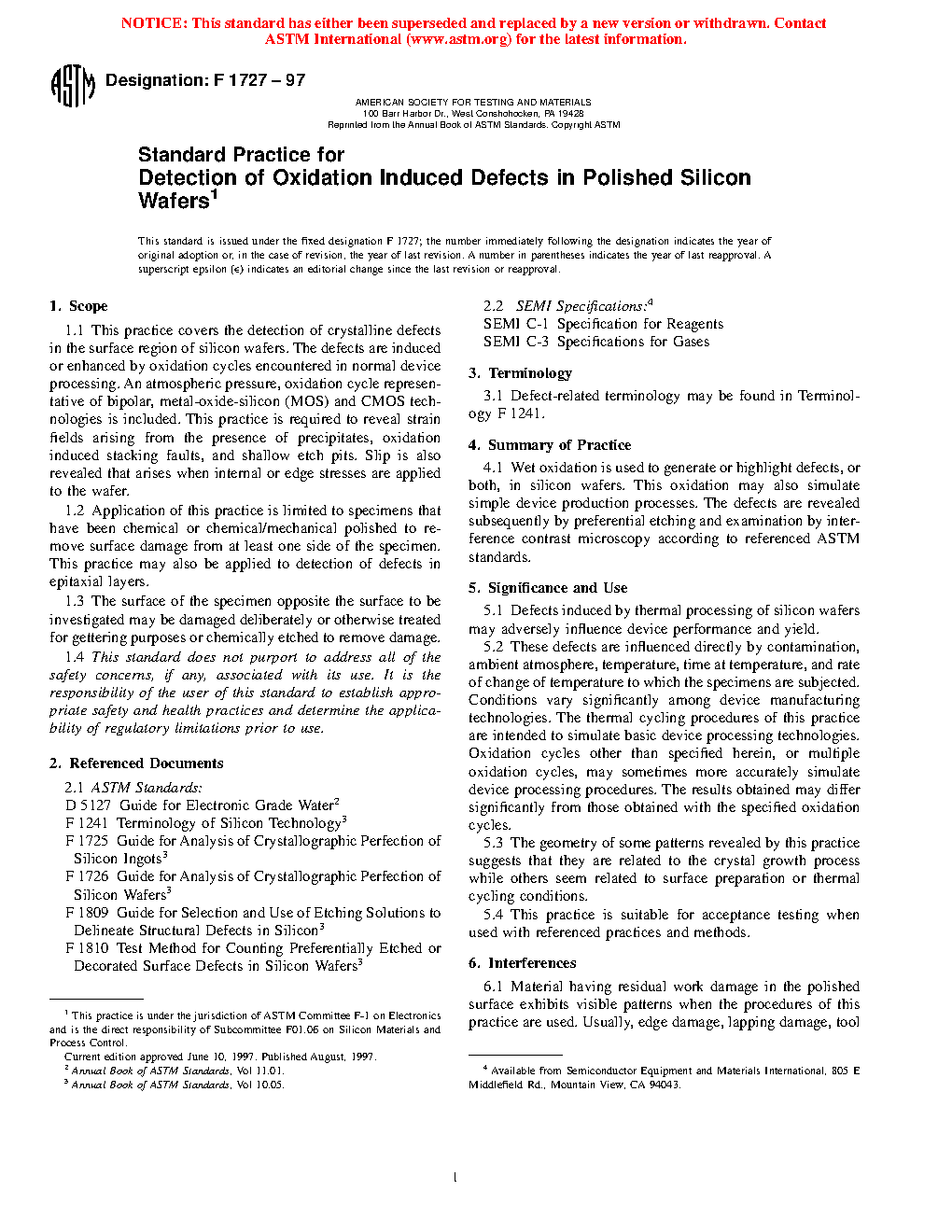 Standard Practice for Detection of Oxidation Induced Defects in Polished Silicon Wafers (Withdrawn 2003)