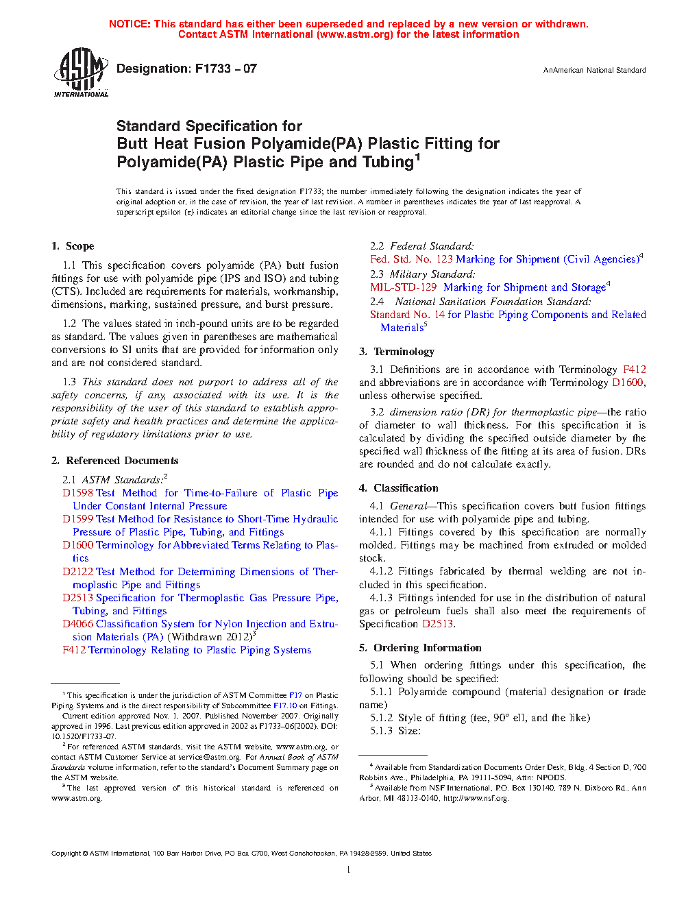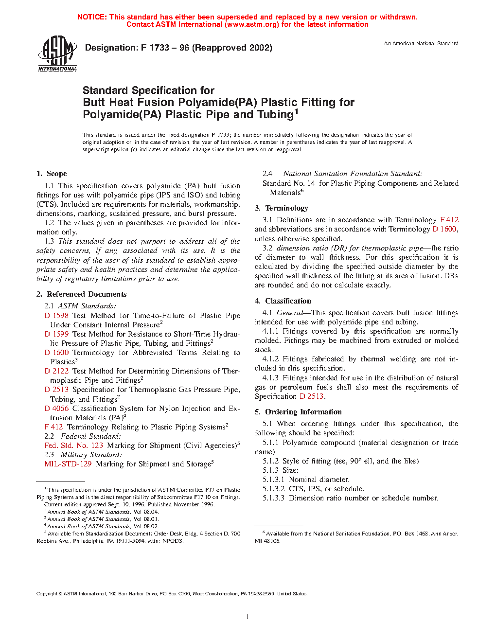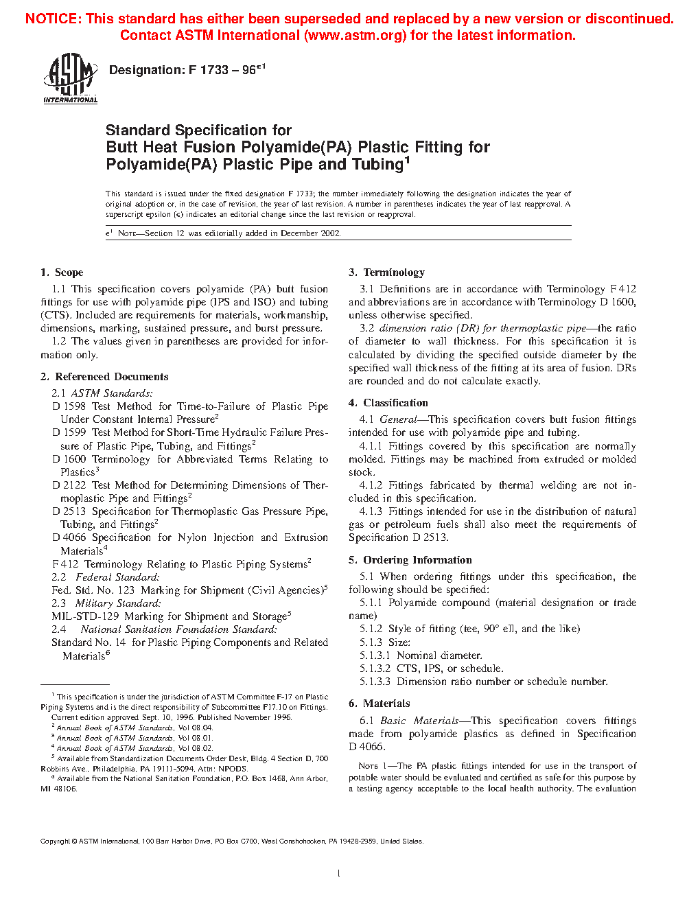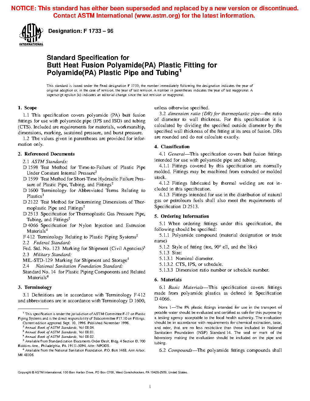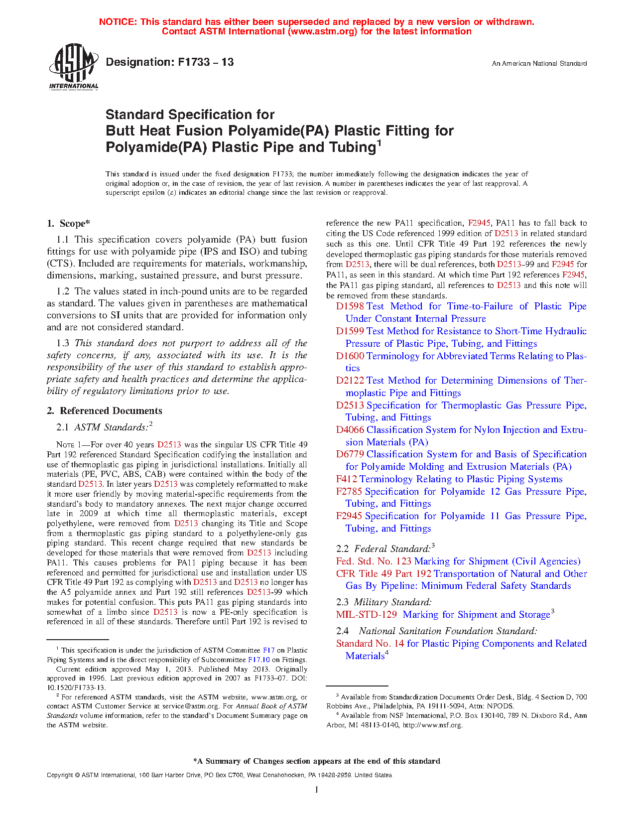 1.1 This specification covers polyamide (PA) butt fusion fittings for use with polyamide pipe (IPS and Metric) and tubing (CTS). Included are requirements for materials, workmanship, dimensions, marking, sustained pressure, and burst pressure.