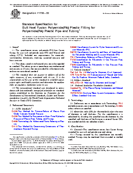 This specification covers polyamide (PA) butt fusion fittings for use with polyamide pipe (IPS and ISO) and tubing (CTS). This specification covers butt fusion fittings intended for use with polyamide pipe and tubing. Fittings covered by this specification are normally molded. Fittings may be machined from extruded or molded stock. Conditioning, dimensions and tolerances, short-term rupture strength, sustained pressure test, and minimum hydrostatic burst pressure test shall be performed to conform with the requirements specified.