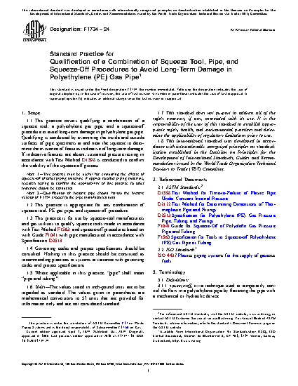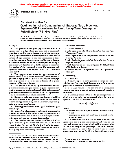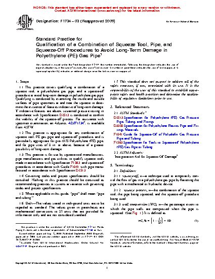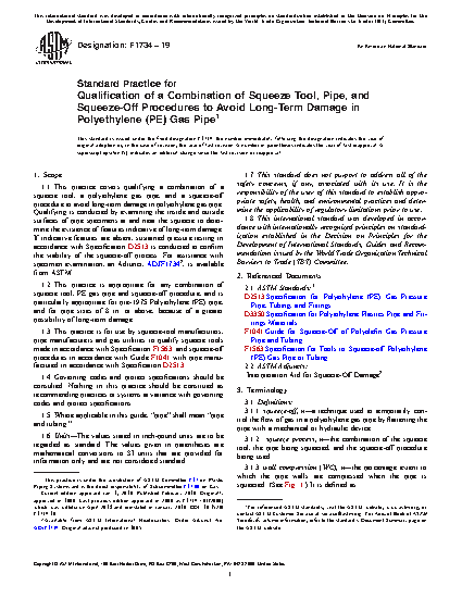 1.1 This practice covers qualifying a combination of a squeeze tool, a polyethylene gas pipe, and a squeeze-off procedure to avoid long-term damage in polyethylene gas pipe. Qualifying is conducted by examining the inside and outside surfaces of pipe specimens at and near the squeeze to determine the existence of features indicative of long-term damage. If indicative features are absent, sustained pressure testing in accordance with Specification D2513 is conducted to confirm the viability of the squeeze-off process. For assistance with specimen examination, an Adjunct, ADJF17342, is available from ASTM.