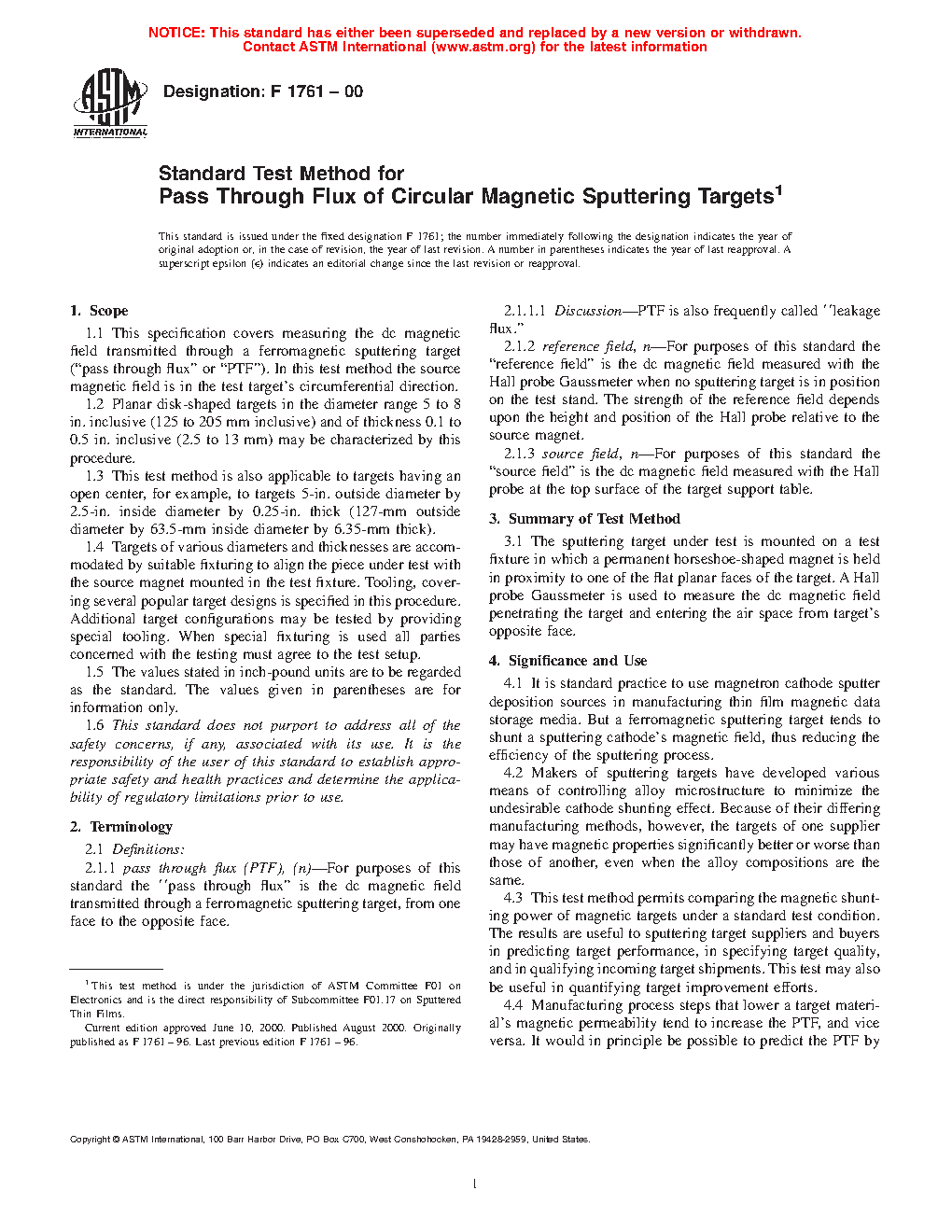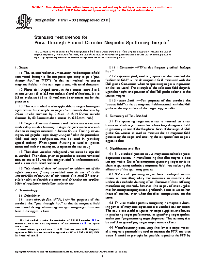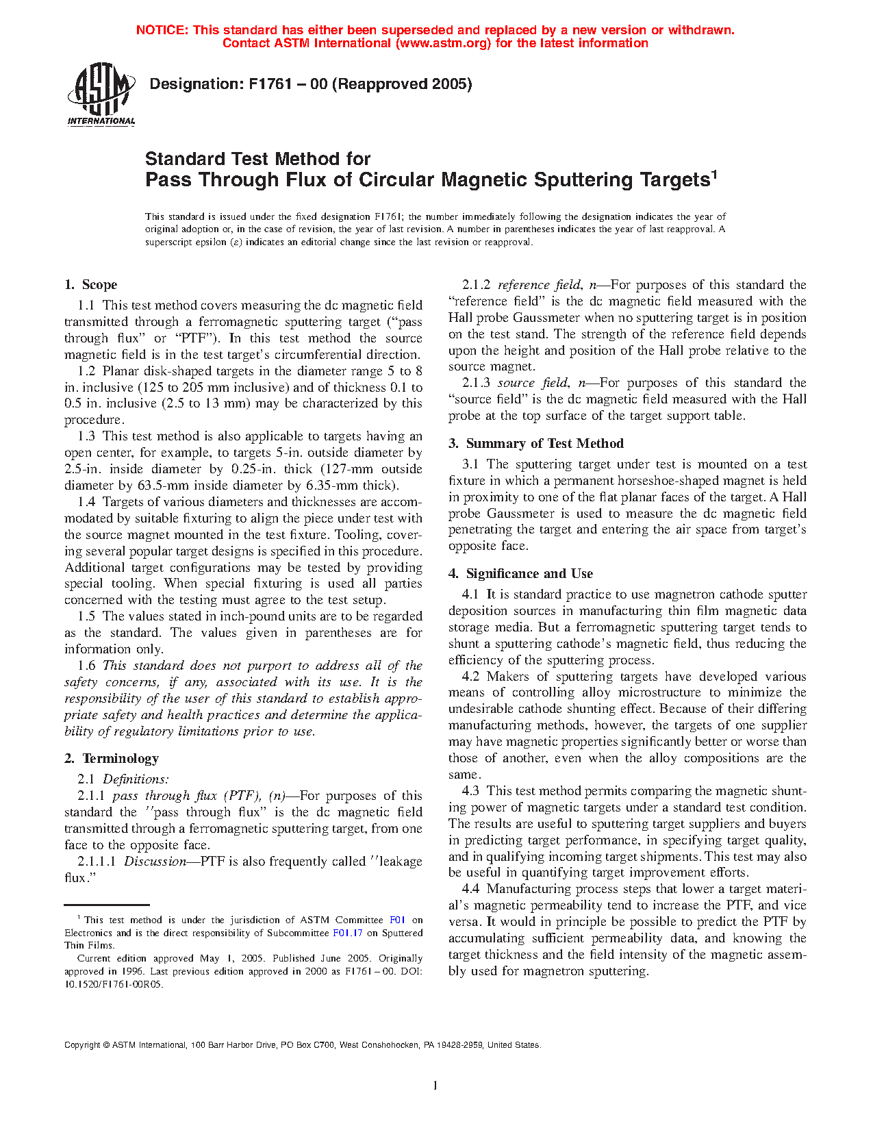 1.1 This test method covers measuring the dc magnetic field transmitted through a ferromagnetic sputtering target (“pass through flux” or “PTF”). In this test method the source magnetic field is in the test target's circumferential direction.