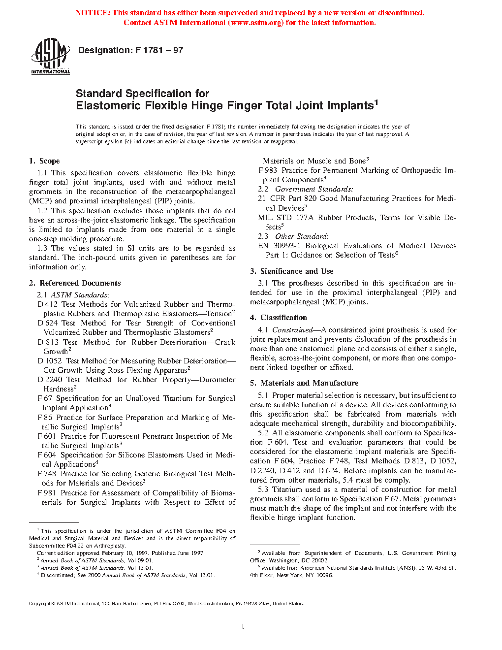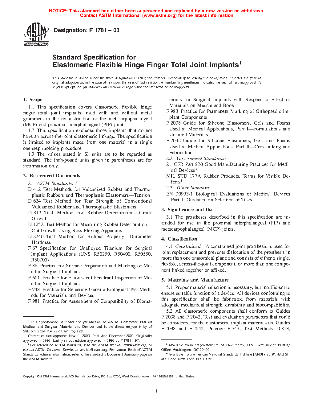 1.1 This specification covers elastomeric flexible hinge finger total joint implants, used with and without metal grommets in the reconstruction of the metacarpophalangeal (MCP) and proximal interphalangeal (PIP) joints.