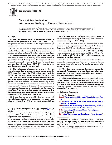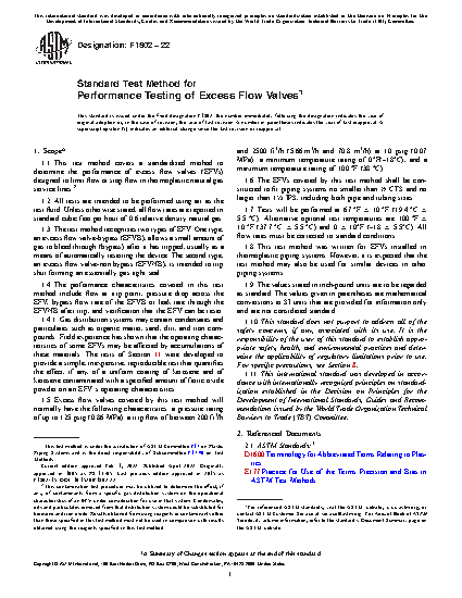 1.4 The performance characteristics covered in this test method include flow at trip point, pressure drop across the EFV, bypass flow rate of the EFVB or leak rate through the EFVNB after trip, and verification that the EFV can be reset.