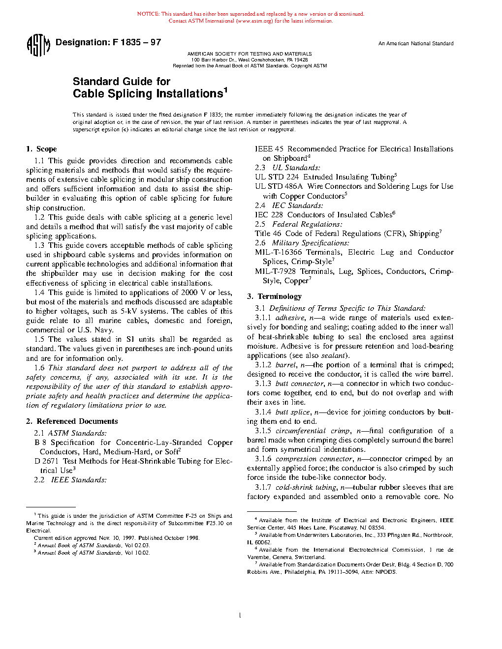 4.3 The use of this guide by a shipbuilder will establish cabling splicing systems that are: simple and safe to install; waterproof; corrosion- and impact-resistant; industry accepted with multiple suppliers available; low-cost methods; and suitable for marine, Navy, and IEC cables.