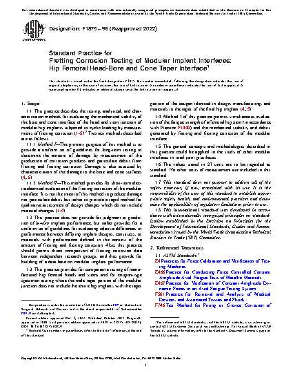 1.3 This practice provides for comparative testing of manufactured hip femoral heads and stems and for coupon type specimen testing where the male taper portion of the modular junction does not include the entire hip implant, with the taper portion of the coupon identical in design, manufacturing, and materials to the taper of the final hip implant (4,5).