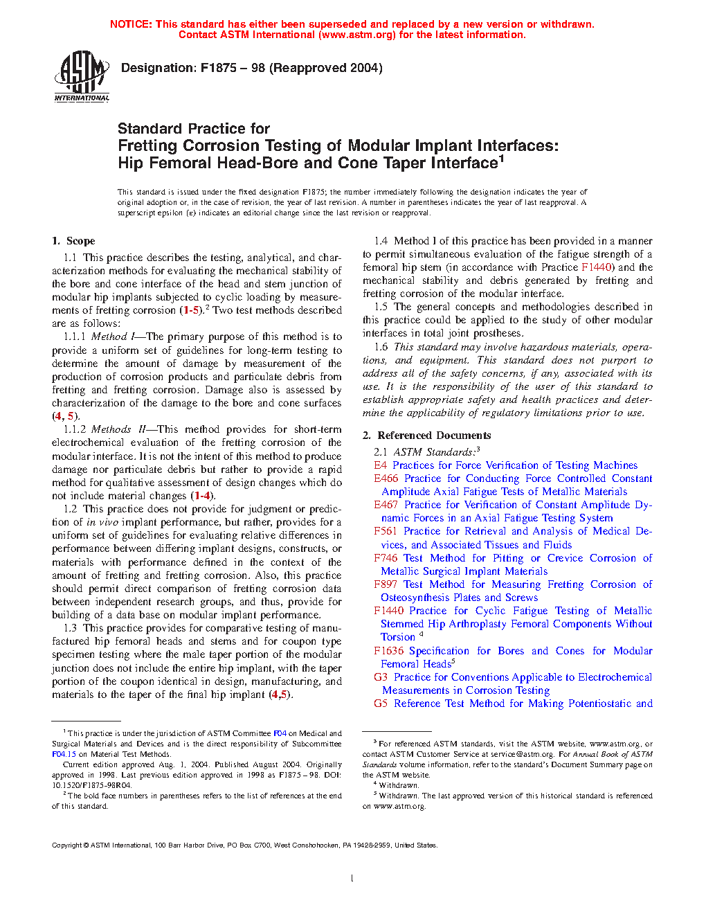1.1.1 Method I—The primary purpose of this method is to provide a uniform set of guidelines for long-term testing to determine the amount of damage by measurement of the production of corrosion products and particulate debris from fretting and fretting corrosion. Damage is also assessed by characterization of the damage to the bore and cone surfaces (4, 5).